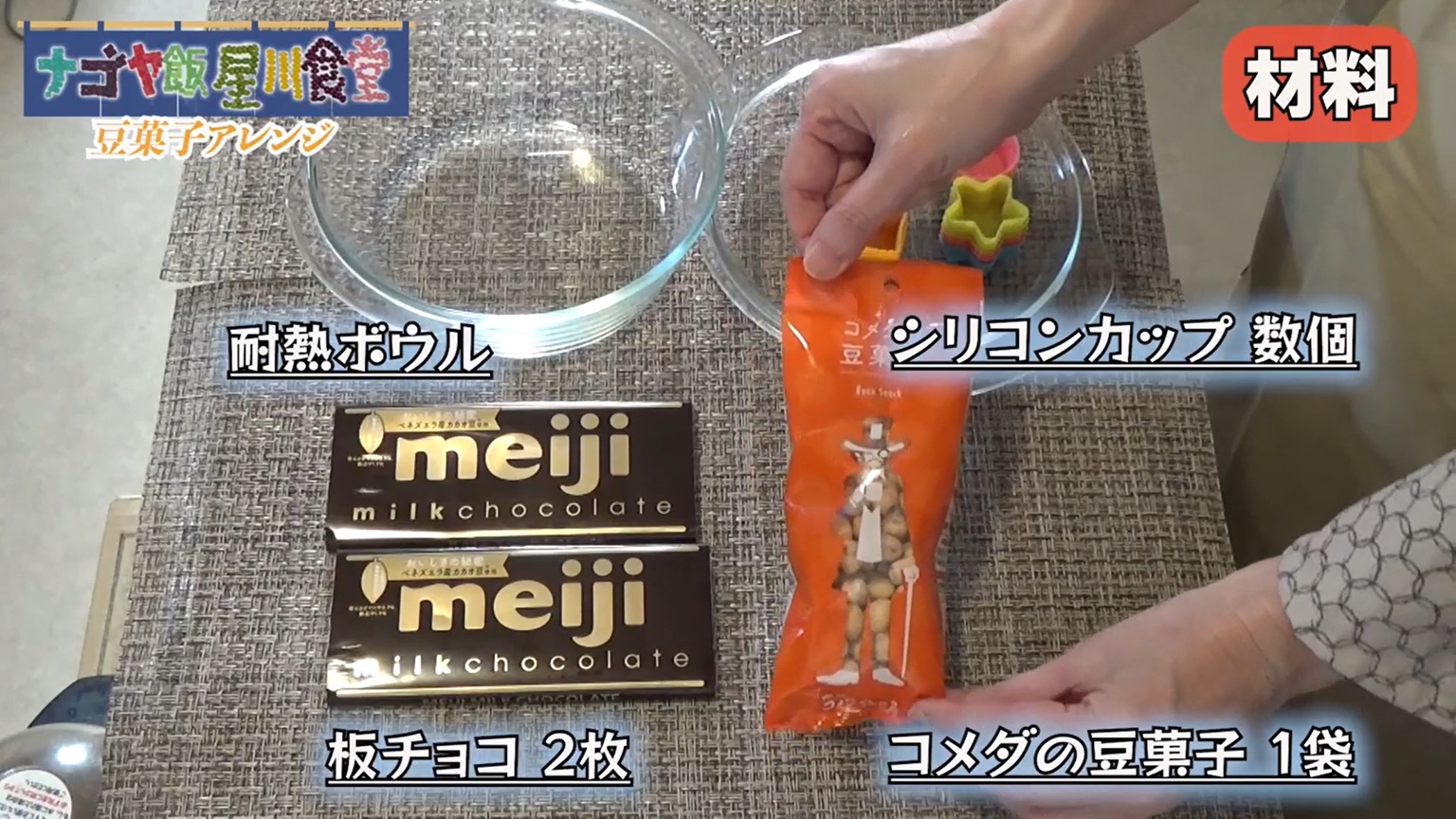 用意する材料は、板チョコ2枚、コメダの豆菓子1袋、耐熱ボウル、シリコンカップ。耐熱ボウルに割った板チョコを入れ、電子レンジ500Wで1分30秒温めていきます。