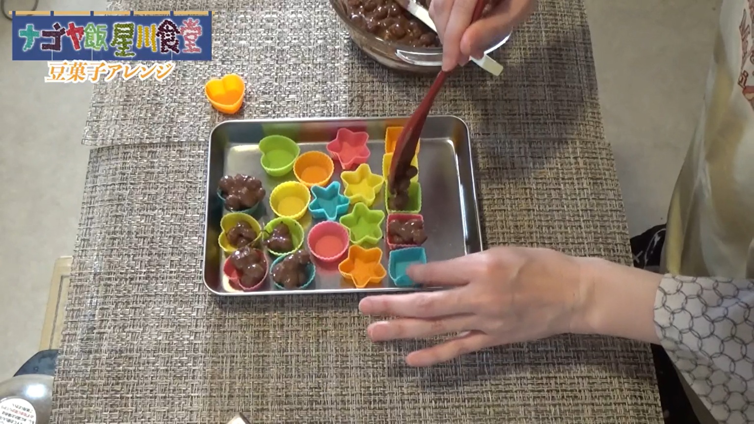 溶けたチョコレートに、豆菓子を投入。ゴムべらでチョコレートと豆菓子を混ぜ、並べたシリコンカップに入れていきます。