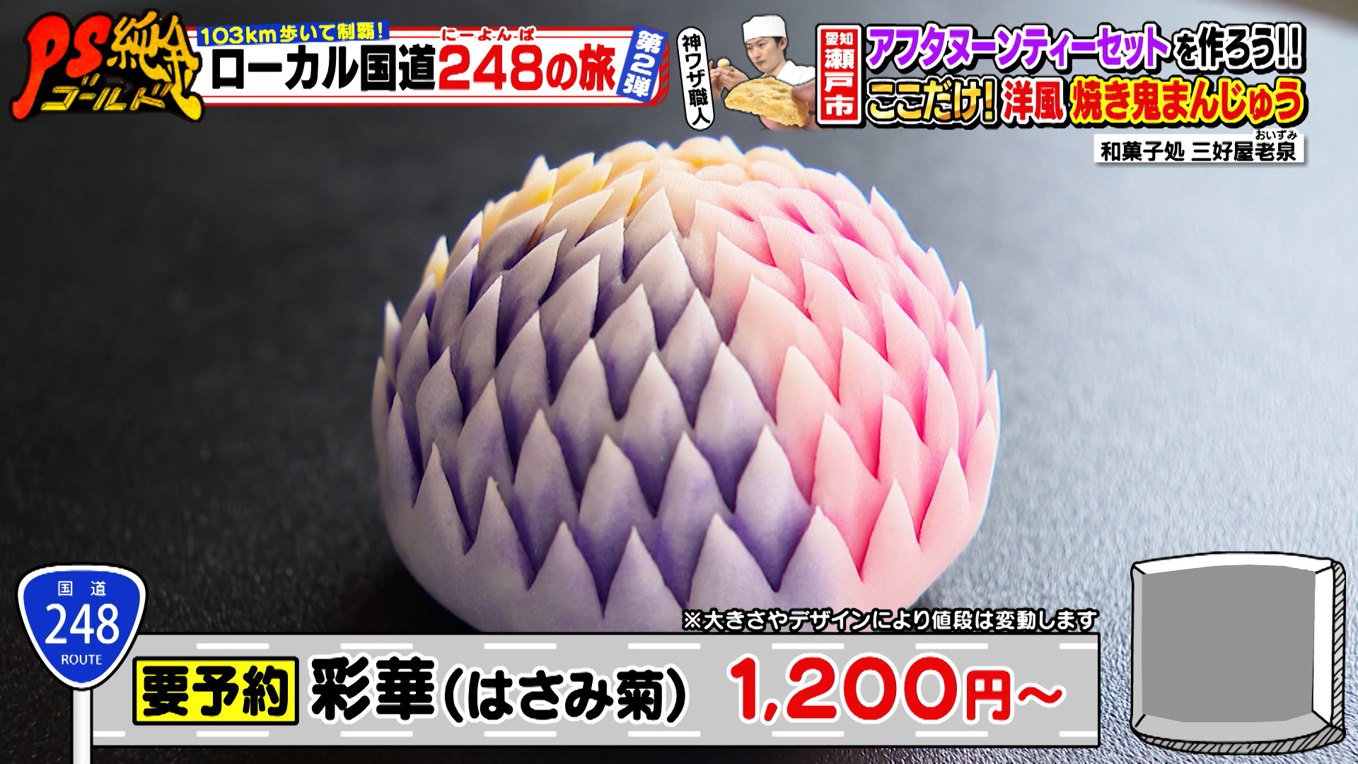 和菓子の「花火(800円~※要予約)」には、棒で繊細なくぼみ模様が施されています。「彩華 はさみ菊(1,200円~※要予約)」は、花弁がはさみで1枚ずつ丁寧に切り出されるなど、翔太さんの神ワザにスタジオメンバーも見惚れます。できたお菓子は「食べるのがもったいない」と思わせる美しさです。