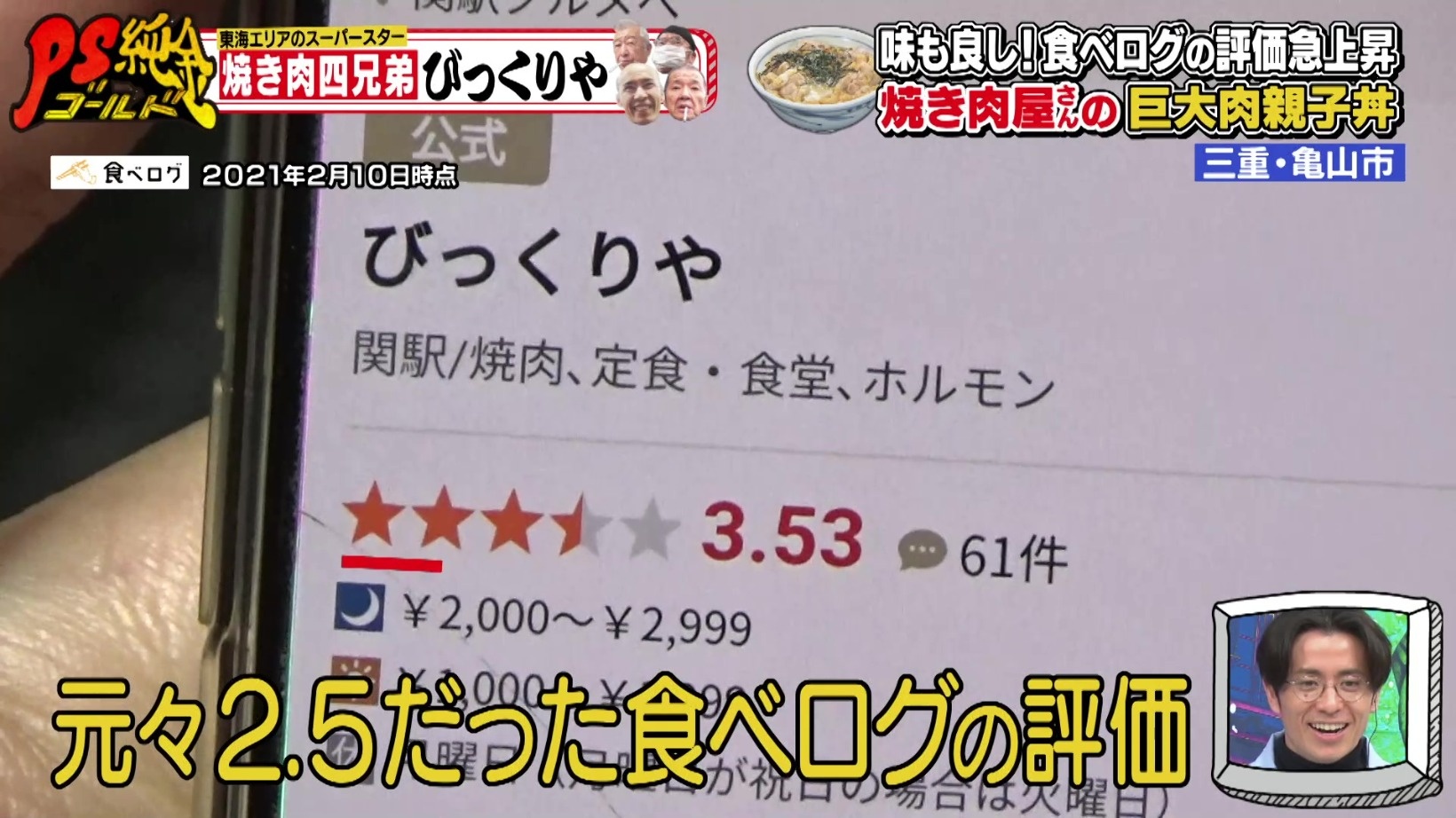 『PS純金(ゴールド)』の密着がはじまる以前は、わずか星2.5だった食べログの評価。2021年2月10日時点では、星3.53と驚きのランクアップを遂げていました。昔と何ら変わらない「びっくりや」の味や接客。その魅力が、世間に広まった証拠だと言えます。