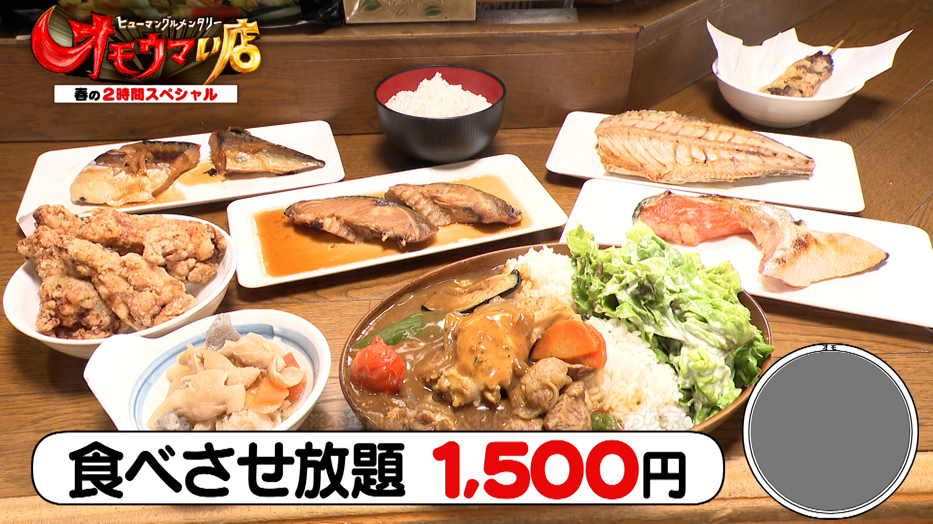 こちらのカレーに加え、もつ煮(通常500円)やタラの煮つけ(通常1,000円)、バジルチキンの竜田揚げ(通常500円)など次々と料理が並び、なんと全9品が「食べさせ放題」で、1,500円という驚きの価格です。