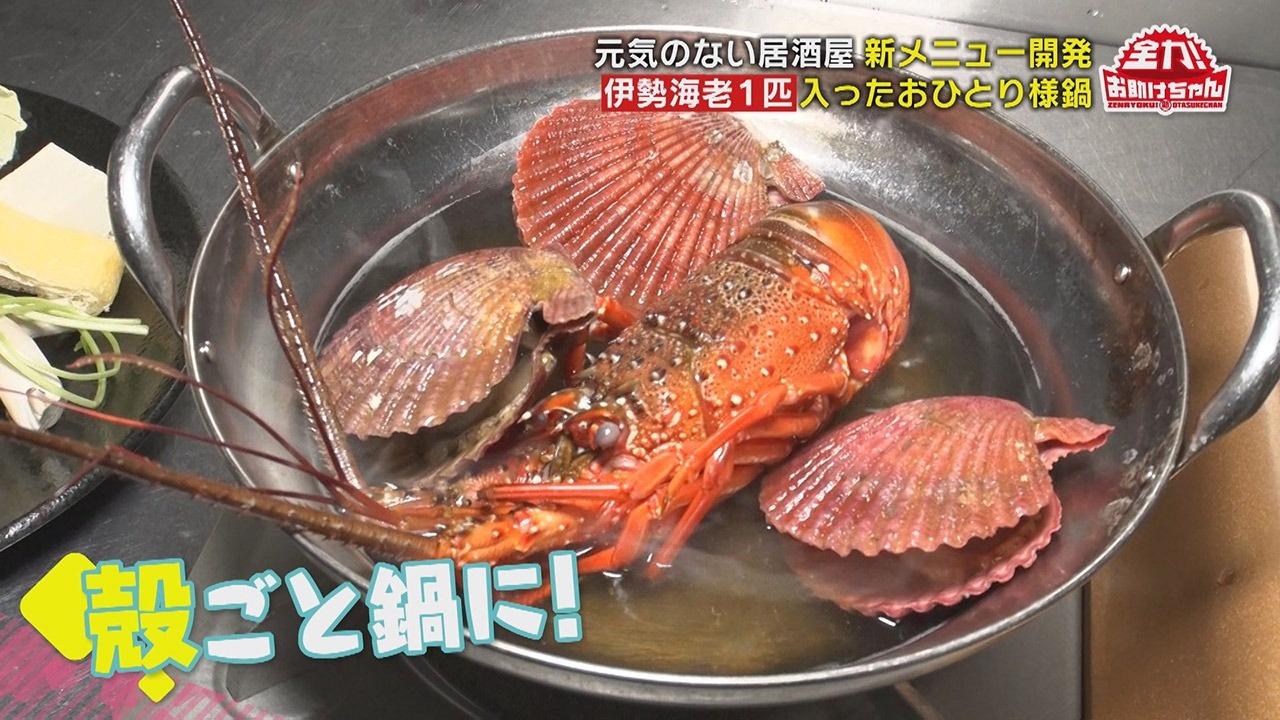 さて、いよいよお出汁の中に伊勢海老を投入。さらに三重県南伊勢町で育ったホタテ似のヒオウギ貝を入れます。通称“あっぱっぱ貝”と呼ばれるこの貝は、ホタテより肉厚で味が濃いのが特徴。そこに野菜やキノコなどの具材も入れて…見た目も豪華な「おひとり様伊勢海老鍋」の完成です!