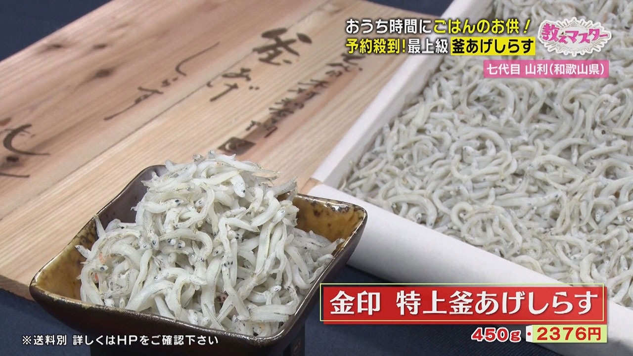 マスター:次は、プチ贅沢の海の幸グルメです。創業から160年しらすを作り続けている、和歌山【しらす創り七代目 山利】の『金印 特上釜あげしらす(450g/2,376円)』。