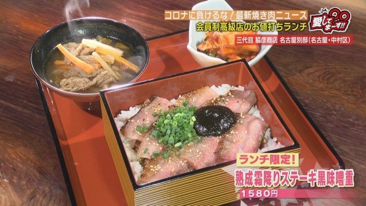 フタを開けると、程よく焼き目がついた、スライスした肉がご飯の上に敷きつめられていて、棚橋さんは思わず「わー、スゲー!」と声を上げます。この肉は、酒粕やみりん粕で1週間熟成させ甘みを出したA5ランクの黒毛和牛。夜のコースでも出しているというこだわりの逸品を、約90グラム使用した『熟成霜降りステーキ黒味噌重』(1580円)です。