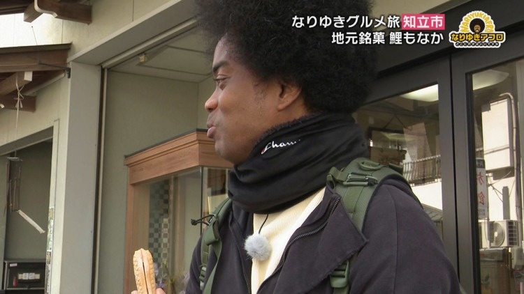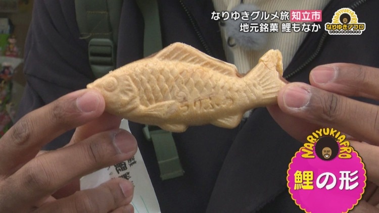町を歩いていると、“なりゆきアフロ”を楽しんで見てくれているという、お子さん連れの人たちと出会います。早速、知立市のおいしいものを聞くと、目の前のお店を指差して『両口屋さんの鯉もなか』と教えてくれました。