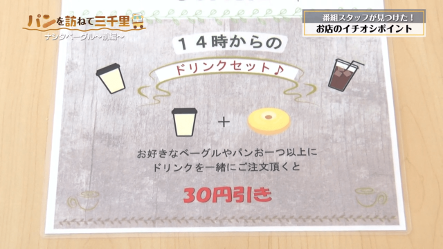 ベーグルやパン一つ以上と一緒にドリンクを注文すると合計金額より値引きのサービスが受けられます。
