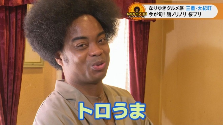 CBCテレビ(東海エリア)で夕方放送の報道情報番組『チャント!』。アフロヘアーがトレードマークの副島淳くんがリポートする、金曜日の人気コーナー、『なりゆきアフロ』は、東海地方の125市町村を巡り、そこで出会った人に「町のおいしいもの」を聞き、その場所へ行って味わう“なりゆきグルメ旅”。