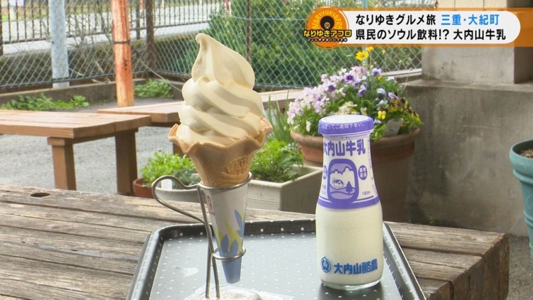 では、参拝にやってくる沢山の受験生を見守ってきた禰宜のMさんに、地元の美味しいものを聞いてみましょう。答えは、地元の特産『大内山牛乳』。国道沿いにどーんとオブジェ看板が立つほど、三重県でかなり有名な牛乳です。ミルク村というお店で売っているよと教えてもらい、早速お店へ。