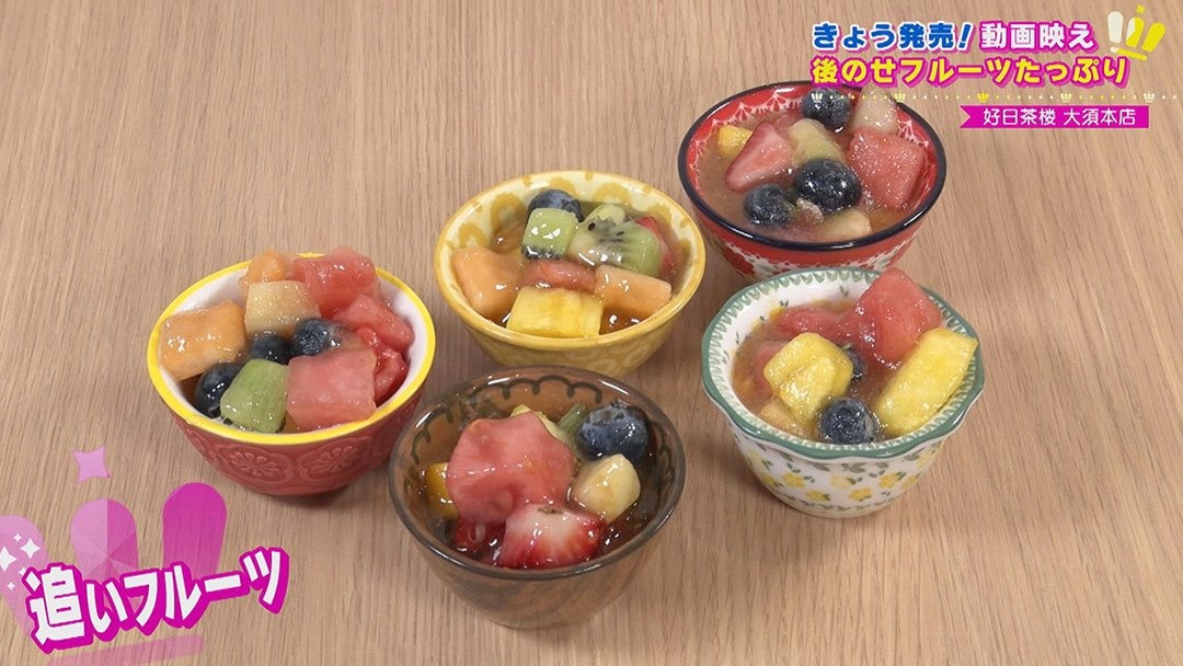 そのまま食べても十分おいしいのですが、最大のポイントは“追いフルーツ"。かき氷の上からフルーツをかけると、カラフルなフルーツがなだれのように流れ落ちる様子が動画映えして楽しめますよ。セットにはフルーツが元々5皿付いていますが、フルーツ好きや映え好きの方にはフルーツの追加もおすすめです。