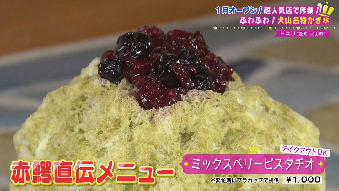 こちらの店主は、かき氷ファンの間で全国的知名度を誇る岐阜の名店『茶屋 赤鰐(あかわに)』で修業。赤鰐イズムを受け継いだ直伝の人気メニュー『ミックスベリーピスタチオ』(1,000円 テイクアウト可)や、『チョコミント』(800円)などをいただくことができます。※繁忙期はプラカップで提供