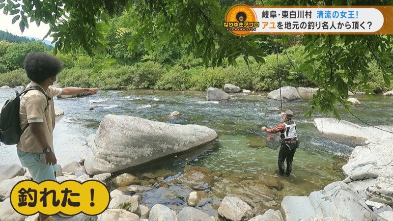 東白川村の「白川」は、川の名前。村の中央を流れる清流で、アユ釣りの人気スポットです。目の前でYさんが釣る瞬間を目撃した副島くんは、「釣れた!すげー!」と大興奮。
