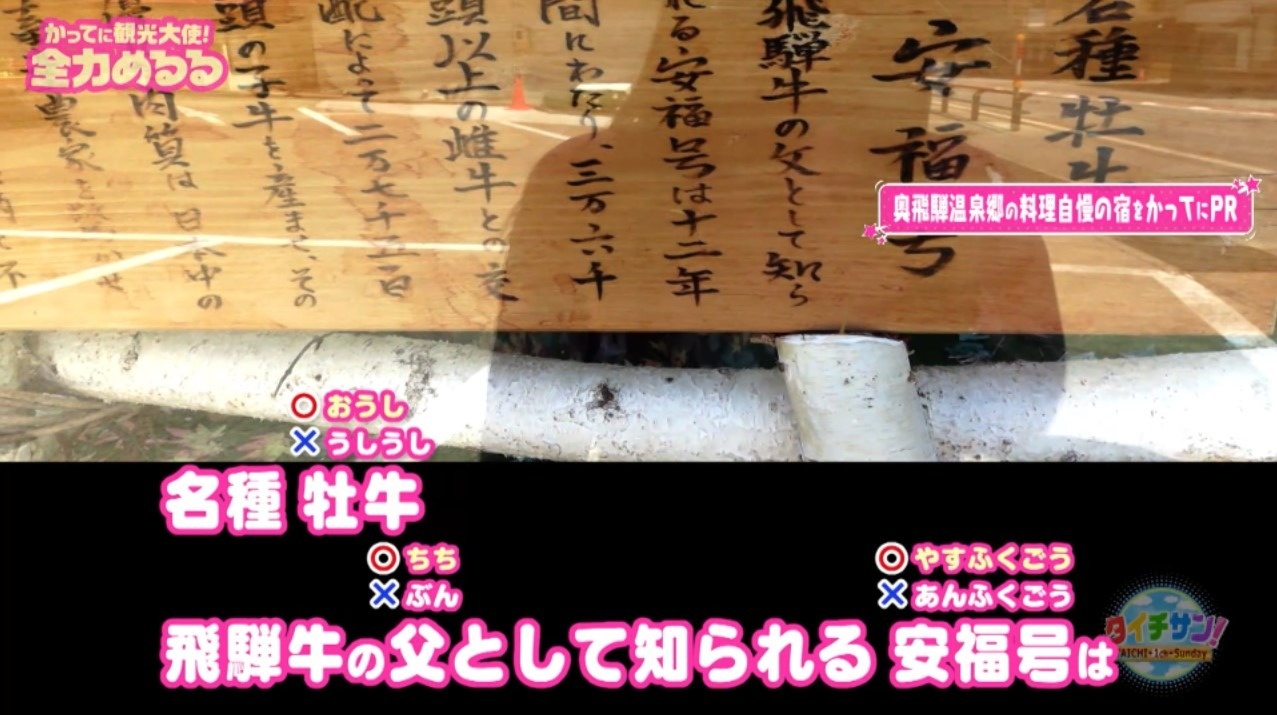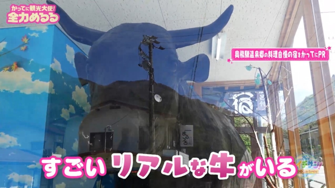宿の入り口には『安福号』という牛のはく製が。飛騨牛を一躍有名にしたとされる雄牛の安福号は12年間で2万7500頭もの子牛を産ませたことから“飛騨牛の父“と呼ばれています!所々読み間違えつつも内容を理解した様子のめるる「めっちゃ大変。すごい牛ってことがわかりました」と感心