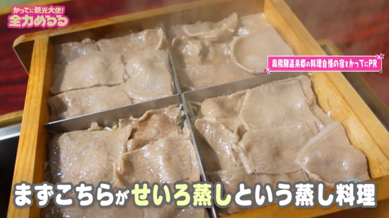 まずは飛騨牛の霜降り肉を使用した看板料理『せいろ蒸し』をいただきます。「う~んとろけるる!やばい、めっちゃおいしい」と感動するめるる。