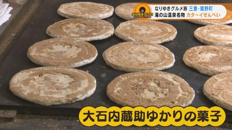 湯の山温泉名物の『大石焼』は、ロープウエイ乗り場の隣にある『喜楽堂(きらくどう)』が1枚1枚手焼きで焼き上げる、素朴で懐かしい味わいの大きくて硬いおせんべい。この地を訪れた赤穂浪士・大石内蔵助にちなんで名づけた…という説もあるそうです。