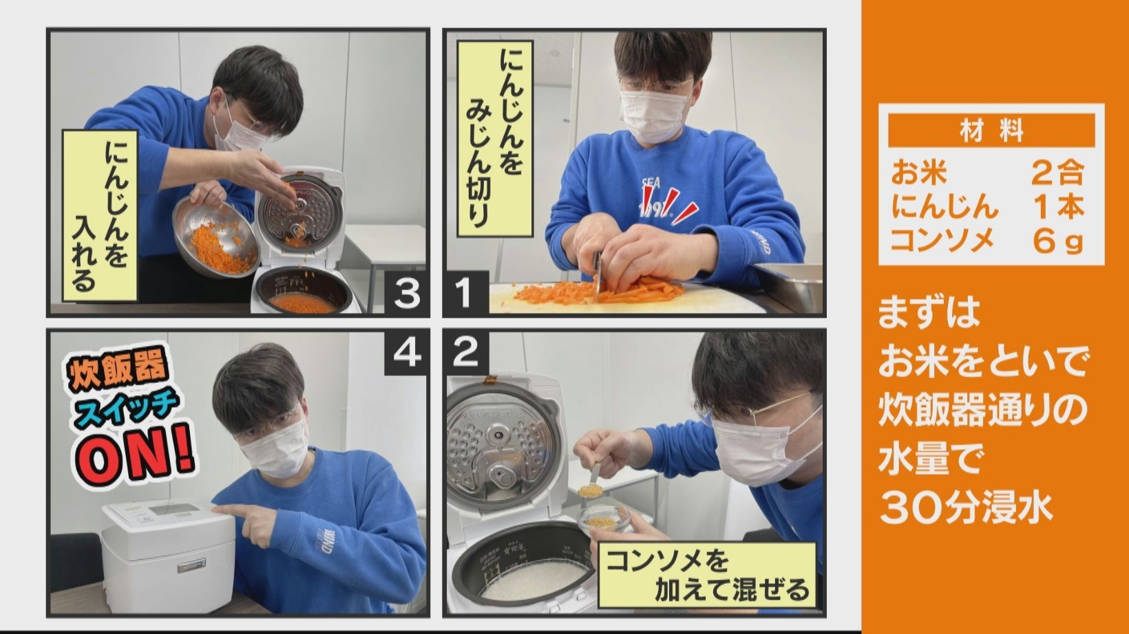 レシピを紹介します。材料は、お米2合、コンソメ6グラム、にんじん1本。まず、お米を研いで炊飯器通りの水量で30分浸水します。次に、にんじんをみじん切りにします。続いて、コンソメを加えて混ぜます。最後に、みじん切りにしたにんじんを入れて炊飯したら完成です!