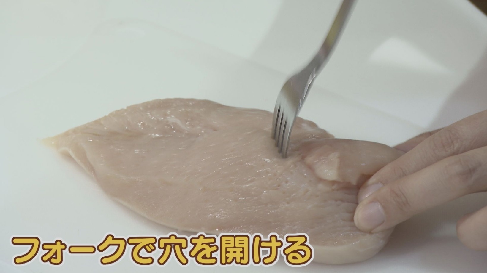 (1)鶏むね肉にフォークで穴を開けてアイラップに投入