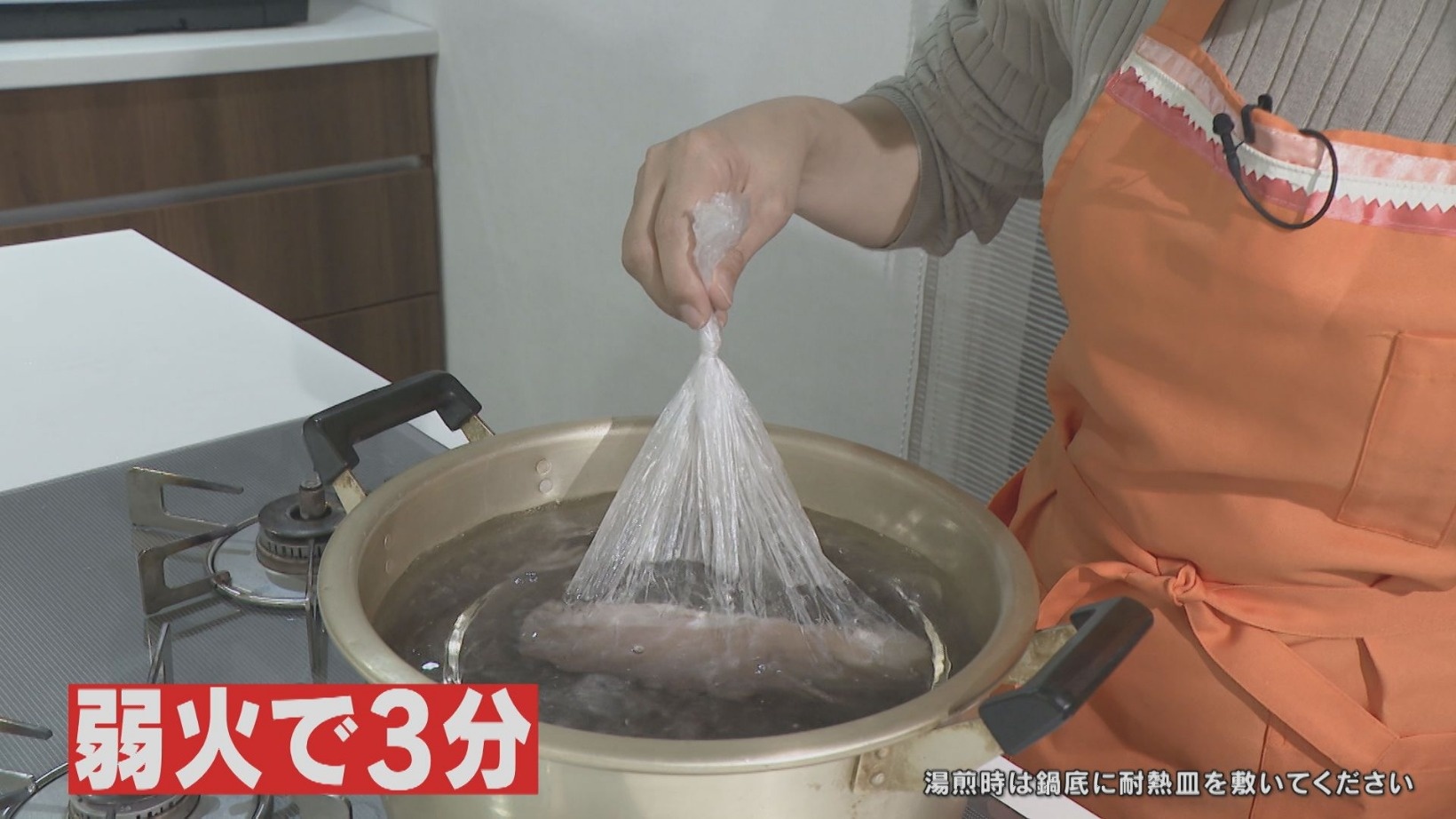 (3)空気を抜いてアイラップを縛り、沸騰したお湯に入れる ※湯煎時はなべ底に耐熱皿を敷いてください