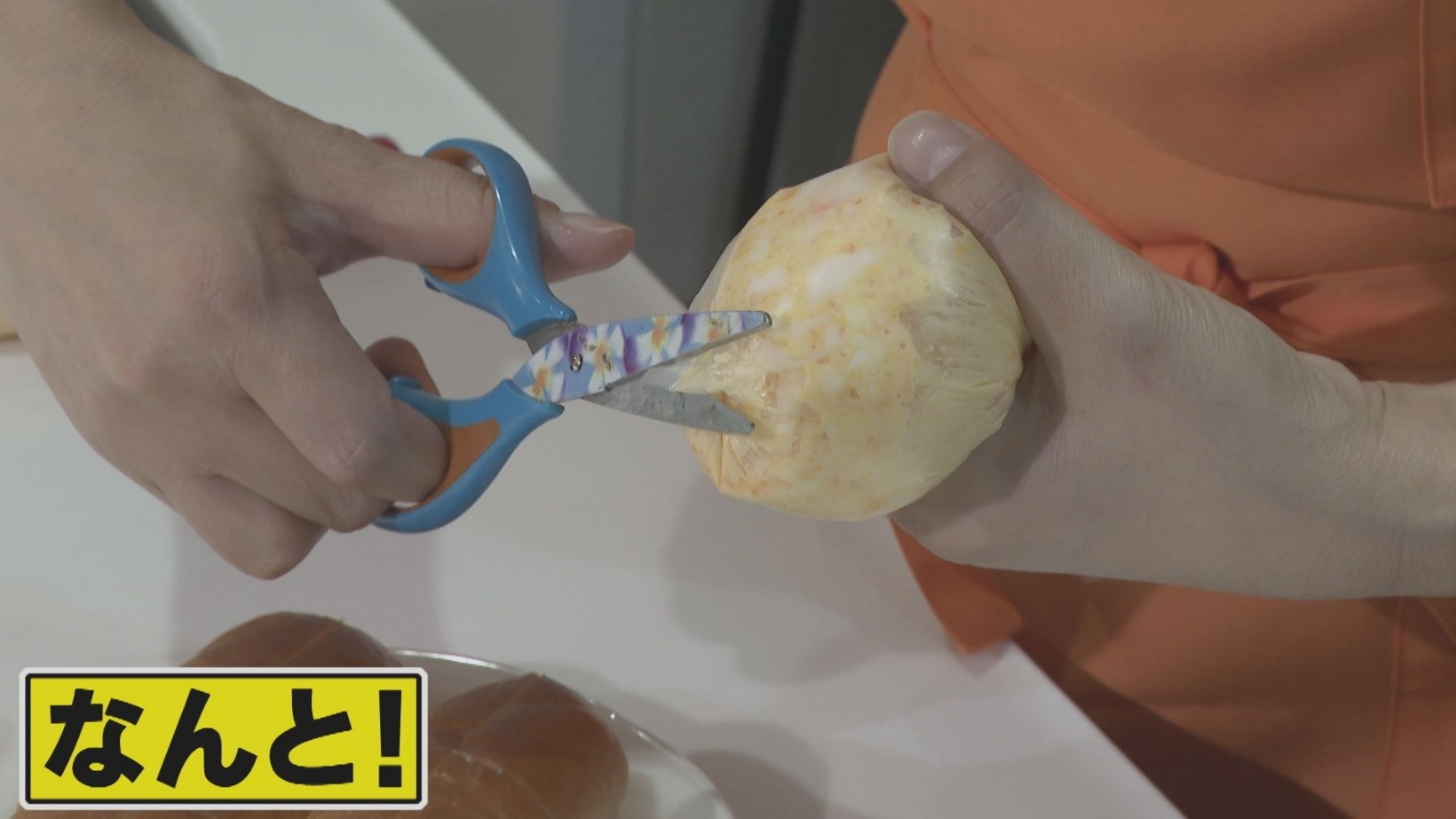 アイラップがあれば、ゆで卵を作らなくてもタマゴサンドができます! アイラップにそのまま卵を割り入れて黄身にフォークで穴をあけ、アイラップの口を軽くねじって電子レンジで加熱。卵が固まったらアイラップの上からつぶし、マヨネーズなどお好みの調味料を入れて混ぜれば、そのままタマゴサンドにも使えます。