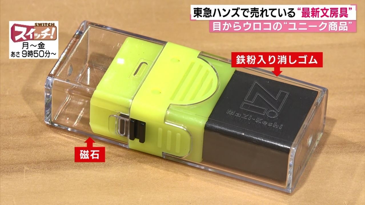 続いては『文房具屋さん大賞2022』で『機能賞』に選ばれた『クツワ マ磁ケシ』(550円)。透明なケースに入った黒い消しゴムのようですが…実は消しカスが出た時に力を発揮するんです!