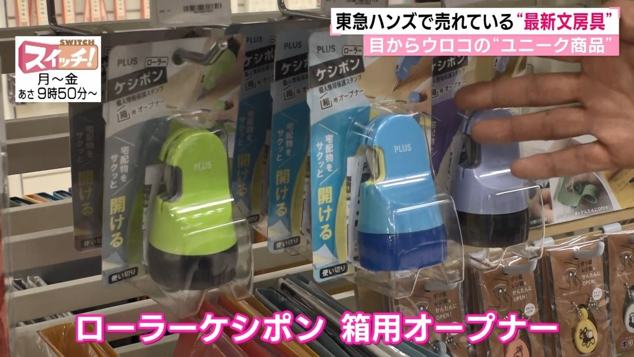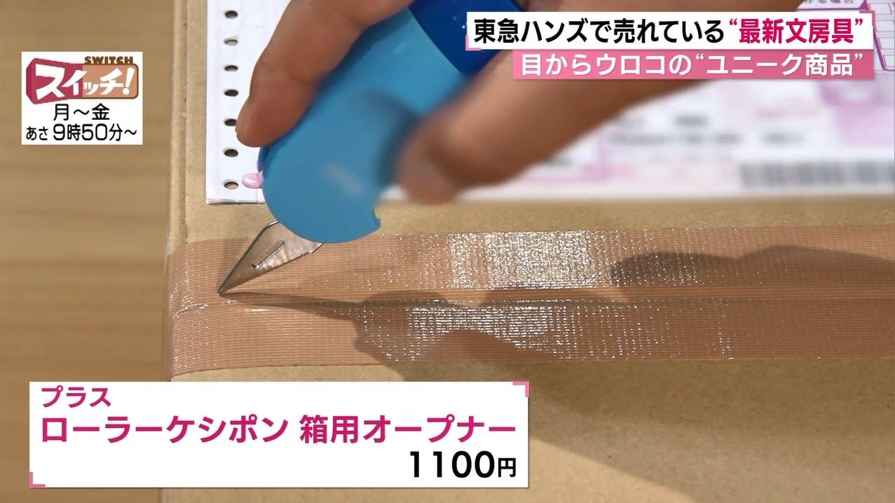 続いてはコロナ渦で利用が増えている宅配便で活躍する多機能文房具『プラス ローラーケシポン 箱用オープナー』(1100円)