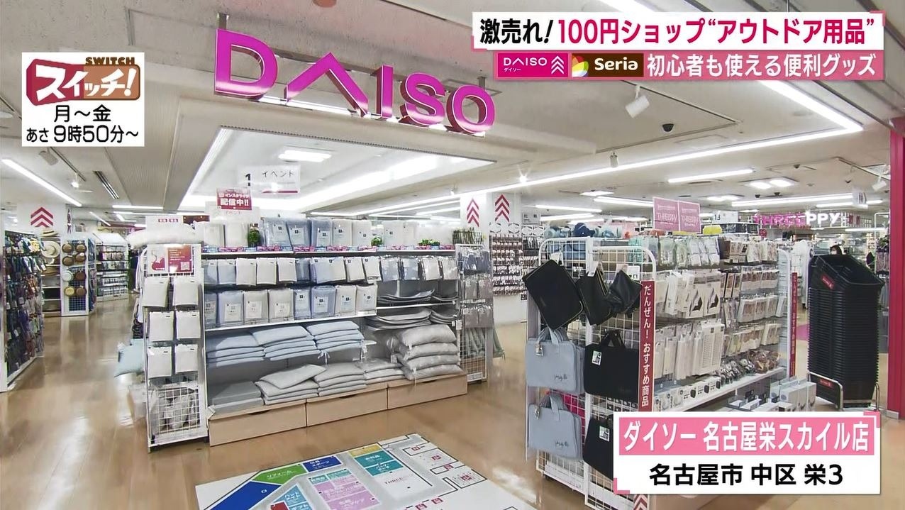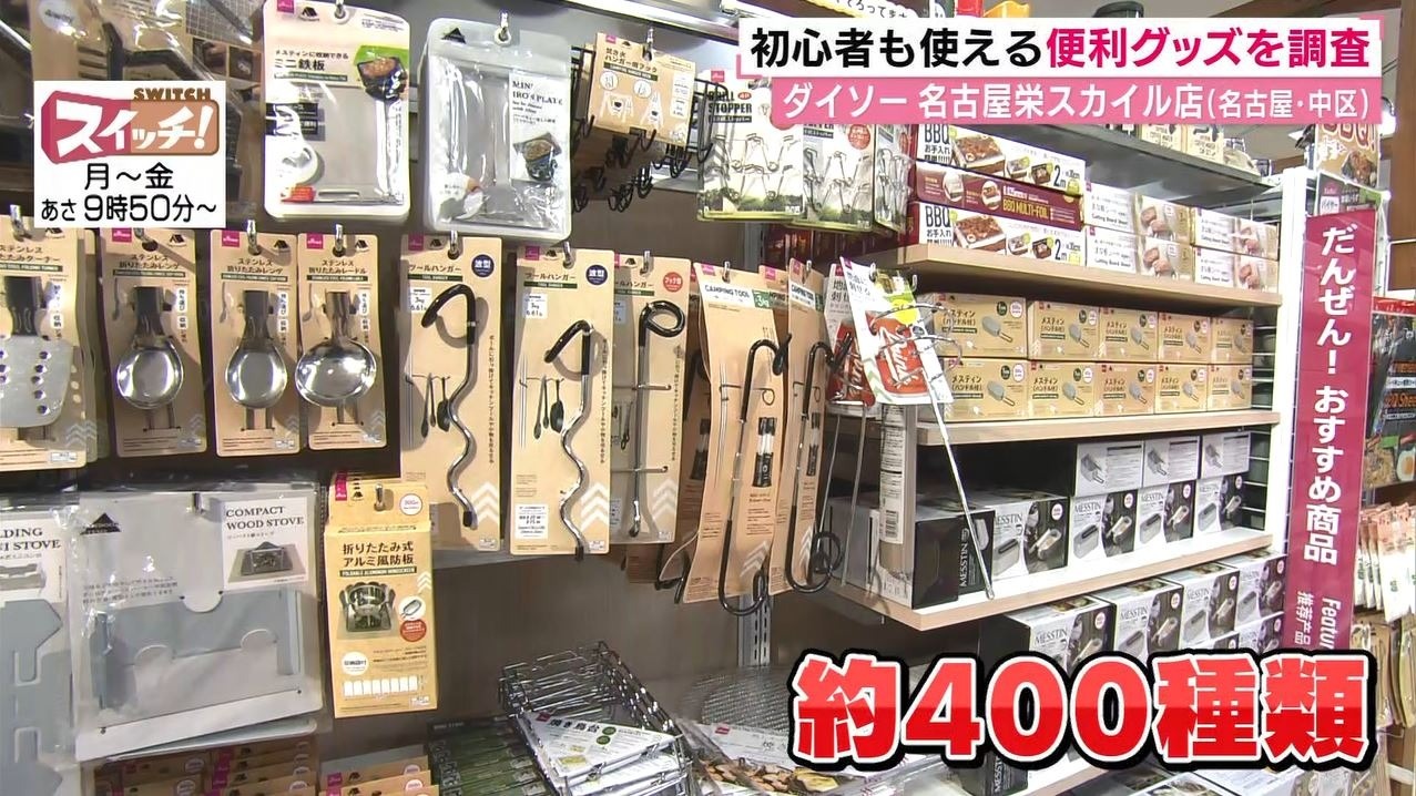 お邪魔したのは『ダイソー 名古屋栄スカイル店』。高まるキャンプ人気を受けてアウトドアの専門コーナーを展開。およそ400種類の商品が並びます。
