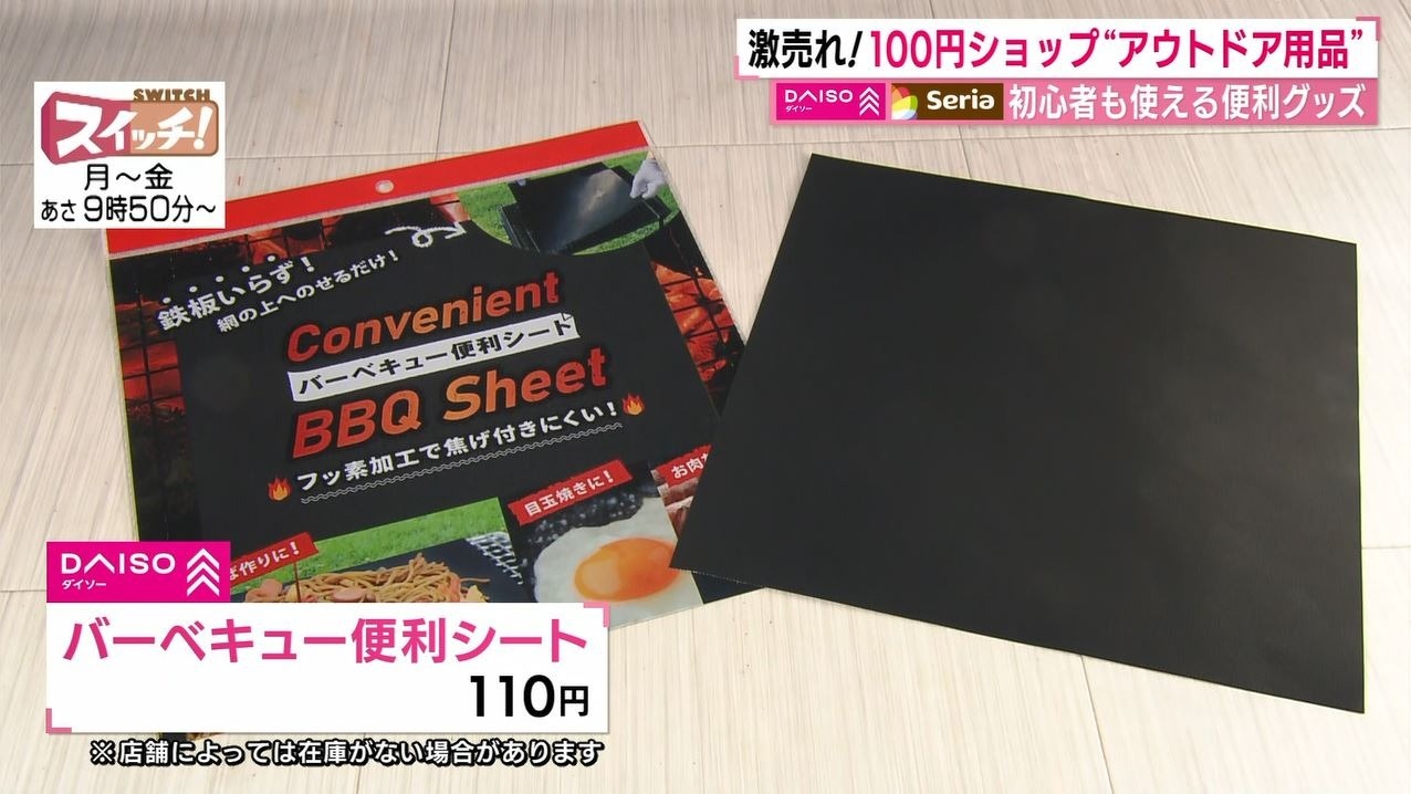 さらに『バーベキュー便利シート』(110円)もキャンパーの間で話題のアイテム!コンロの上にのせて使えるシートで、重たい鉄板を持って行かなくても焼きそばなどの鉄板メニューが手軽に作れます。