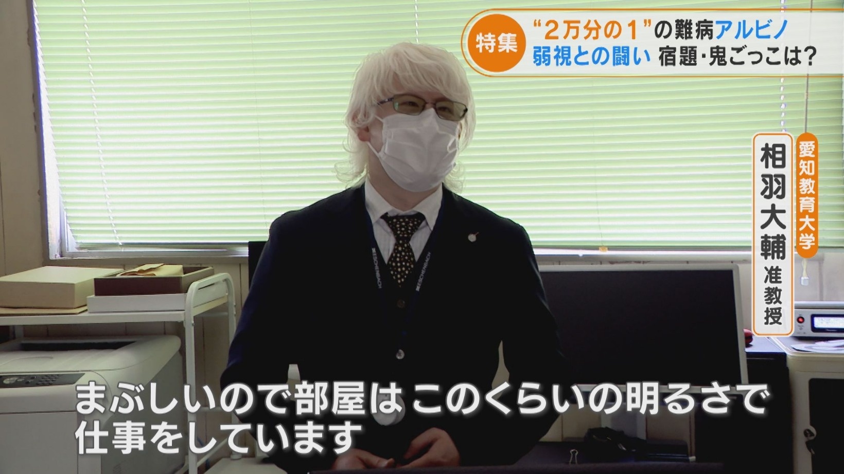 アルビノを抱えながら大人になり、いま教育現場や社会生活への対応が重要と訴えている、愛知教育大学の相羽大輔准教授(40歳)。教育現場での障害者支援の在り方について研究しています。個人差がありますが、アルビノの人には光をまぶしく感じる「羞明(しゅうめい)」と呼ばれる症状があります。その為、相羽さんは研究室で照明はほとんど使わず、外出の際は遮光眼鏡や日傘が欠かせません。