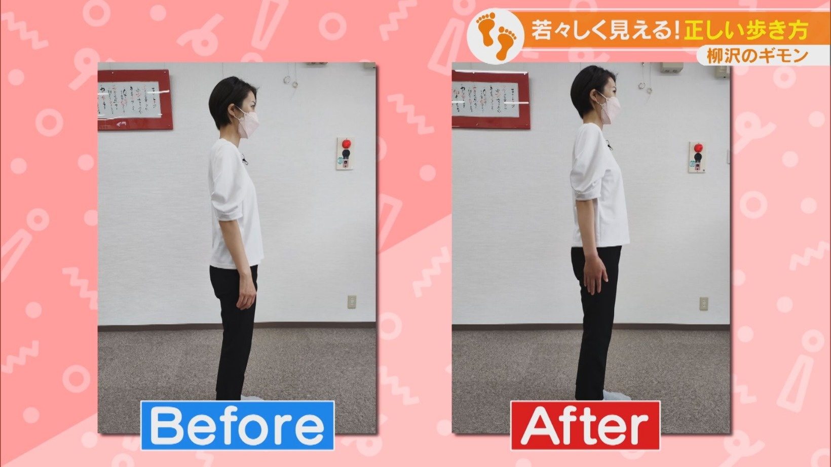 さて「正しい歩き方」の3つのコツを教わりました。「姿勢」「足の出し方」「手の振り方」を全て意識しながら歩いてみると、なかなかすぐには完璧に実践できません。それでも約1時間のレッスンで、前かがみだった歩き方が、見違えるように変わりました。レッスン前は猫背で頭も下がっていましたが、レッスン後は後ろ重心になり、しっかり胸を張って歩けています。今井先生も「20代後半くらい」と太鼓判を押します。