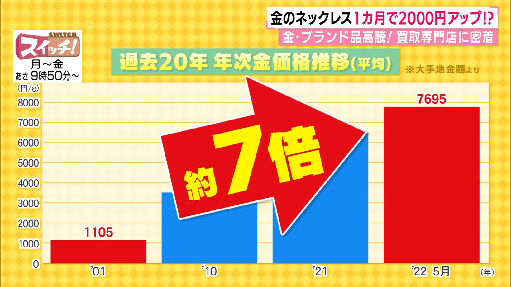 金の価格高騰もあり、『なんぼや』では金の取り扱いが増えているそう。金価格の推移をグラフで見ると、およそ10年前には金1gで1105円。現在は約7700円にまで高騰し、比べると7倍近くになっています。