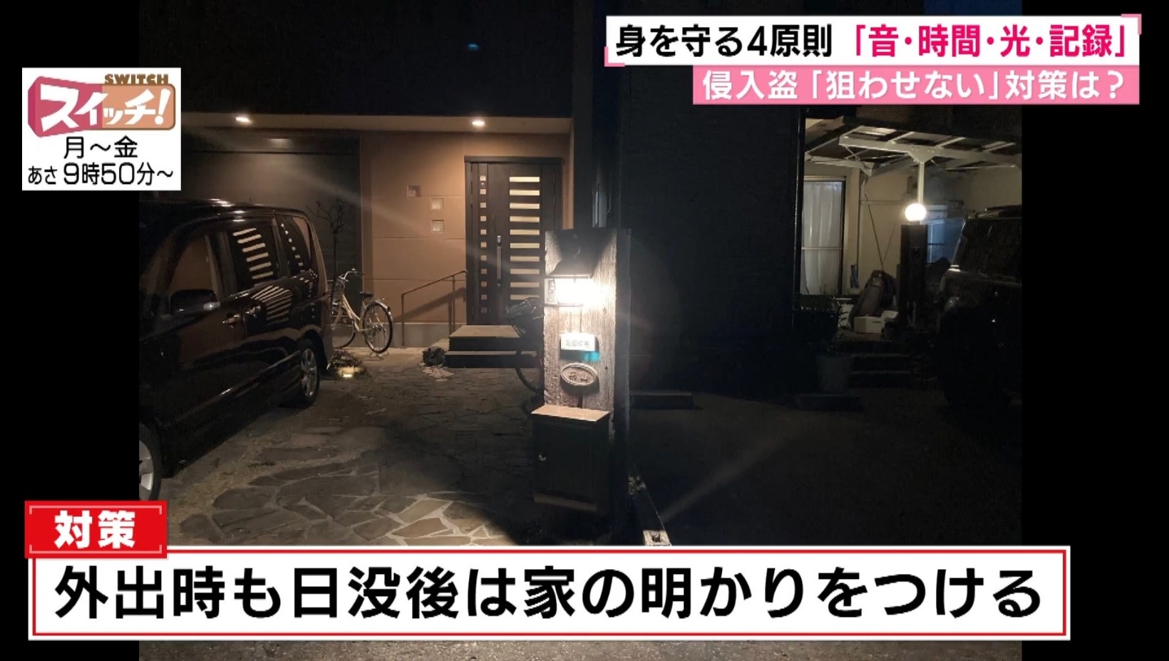 外出時も日没後は室内の電気をつけたり、家の周りを常に明るくしておくことが効果的だといいます。家に誰もいないということを犯人に悟られないことが、防犯の上で大切です。