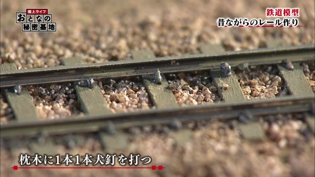このジオラマには、およそ1万4000本の枕木を使ったとか。等間隔に並べた枕木の上にレールを敷き、固定させる。この時用いるのが、昔の線路作りに使われていた犬釘。地方のローカル線に行くとまだ犬釘が残っているらしい。この犬釘を一本一本埋めていくという、気が遠くなるような作業。レール作りも蒸気機関車が走っていた頃の方法を再現する、それが鈴木さんのこだわりなのだ。