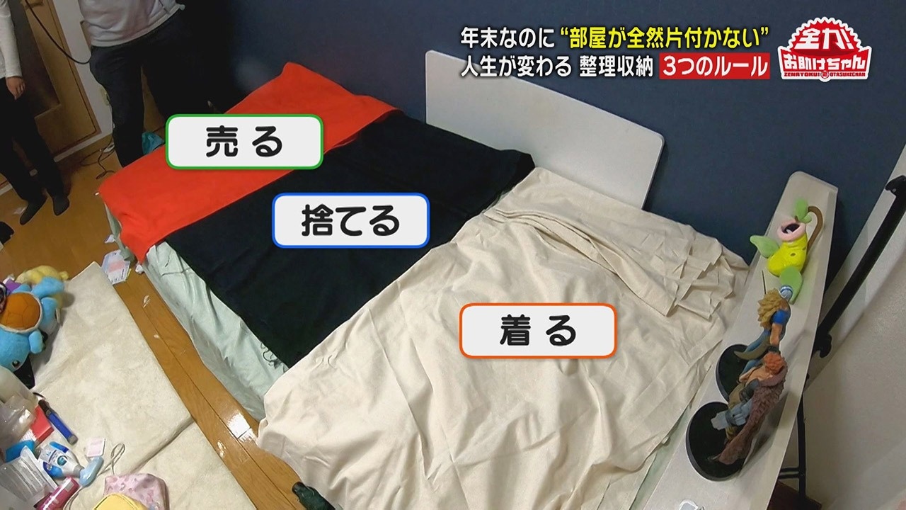部屋に散乱した大量の服を「着る・捨てる・売る」に分けていきます。