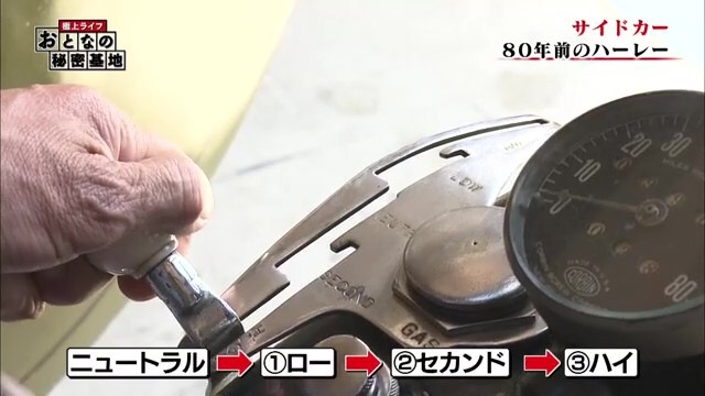 80年前に作られたビンテージハーレー、今のバイクとは操作方法もかなり違うようだ。足でクラッチを切ってそれからミッションを入れるらしい。ハンドルの左下にシフトレバーが付いている。ニュートラルからロー・セカンド・ハイと、3段階に切り替えることができるのだ。「車と一緒。少しは不便ですけどこれがまた面白いのよね。手でチェンジするのが」と飯田さんは言う。実はこのシフトレバー、よく見るとローの上にもう一つ「リバース」のレバーが。飯田さんのハーレーはバックもできてしまうのだ。
