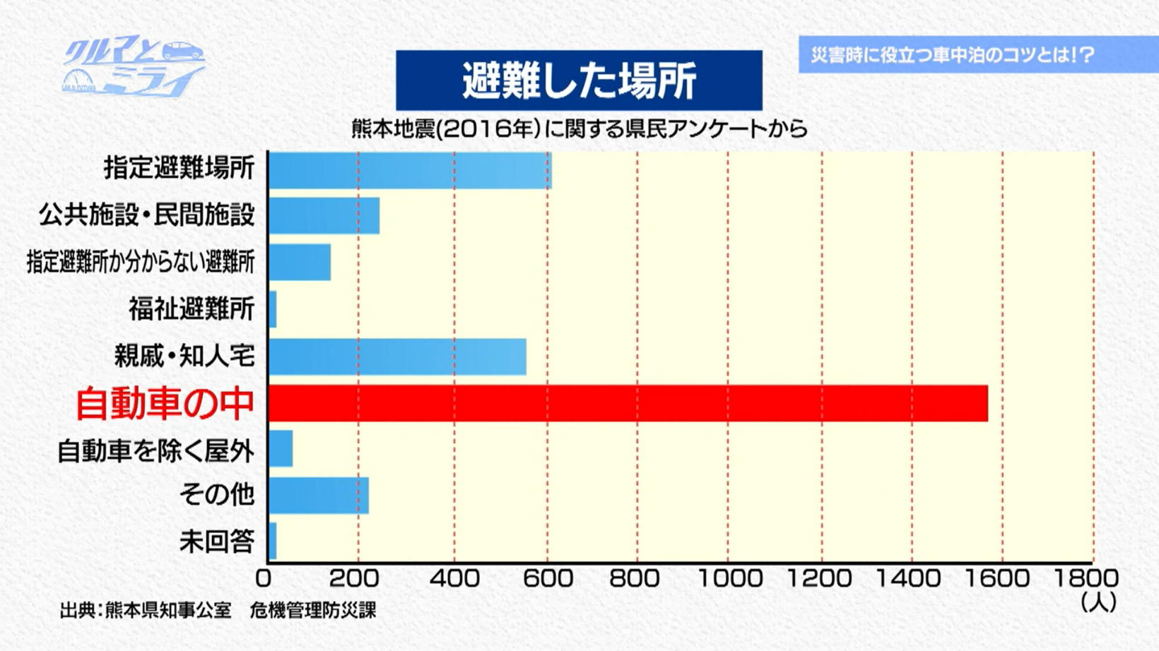 災害時、車で寝泊まりする「車中泊」を選択する可能性もあります。熊本県知事公室危機管理防災課によると、2016年に発生した熊本地震の際、熊本県民の6割が自動車の中で避難していたといいます。