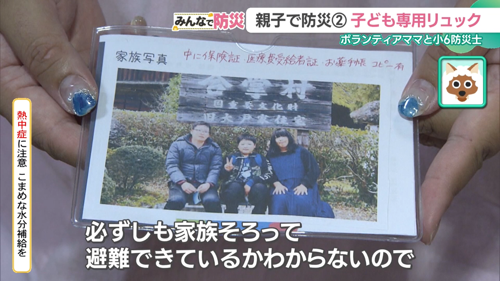 また、家族の特徴を伝える手段として入れておきたいのが「家族写真」。地震発生時、必ずしも家族全員が揃って避難できるとは限りません。家族とはぐれた時、子どもの心を落ち着かせるアイテムとしても役立ちます。
