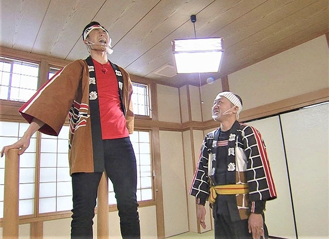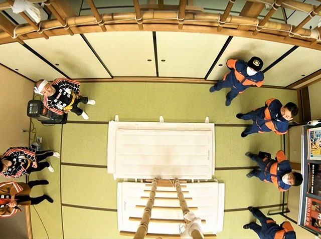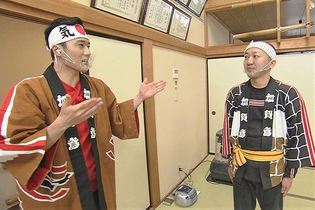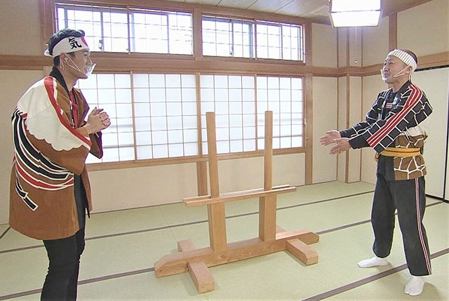 画面が現場に戻ると、石橋アナはいつの間にか法被に着替え分団の建物の中に。そこで指導員をしている中川貴裕さんとご挨拶します。その横では、石引分団の登り手としては最年少26歳の田島裕也さんが、梯子登りの練習に取り組んでいました。普段は実家の梨農園で働く田島さんですが、今日は得意の演技『横大(よこだい)』を披露してくれるそう。中川さんによると「加賀鳶には27種類の演技があり、『横大』は最も力を使う技」とのこと。