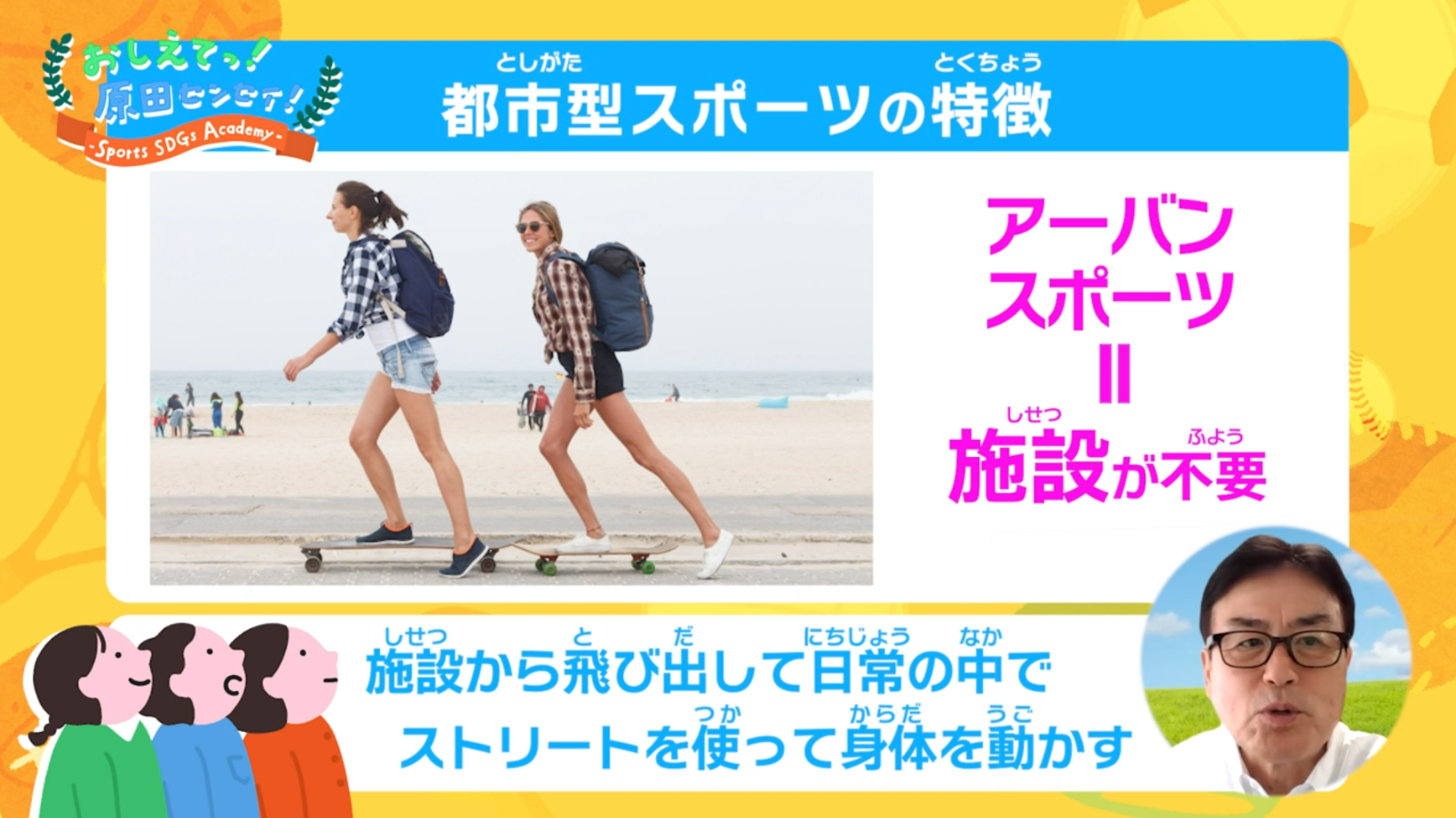 『大阪体育大学』学長・原田宗彦先生によると、「アーバンスポーツ」は、スポーツSDGsと相性の良いスポーツ。アーパンスポーツとは、東京オリンピックでも注目を集めた、若者に人気の都市型スポーツのこと。スケートボードやスポーツクライミング、BMXなどが例に挙げられます。