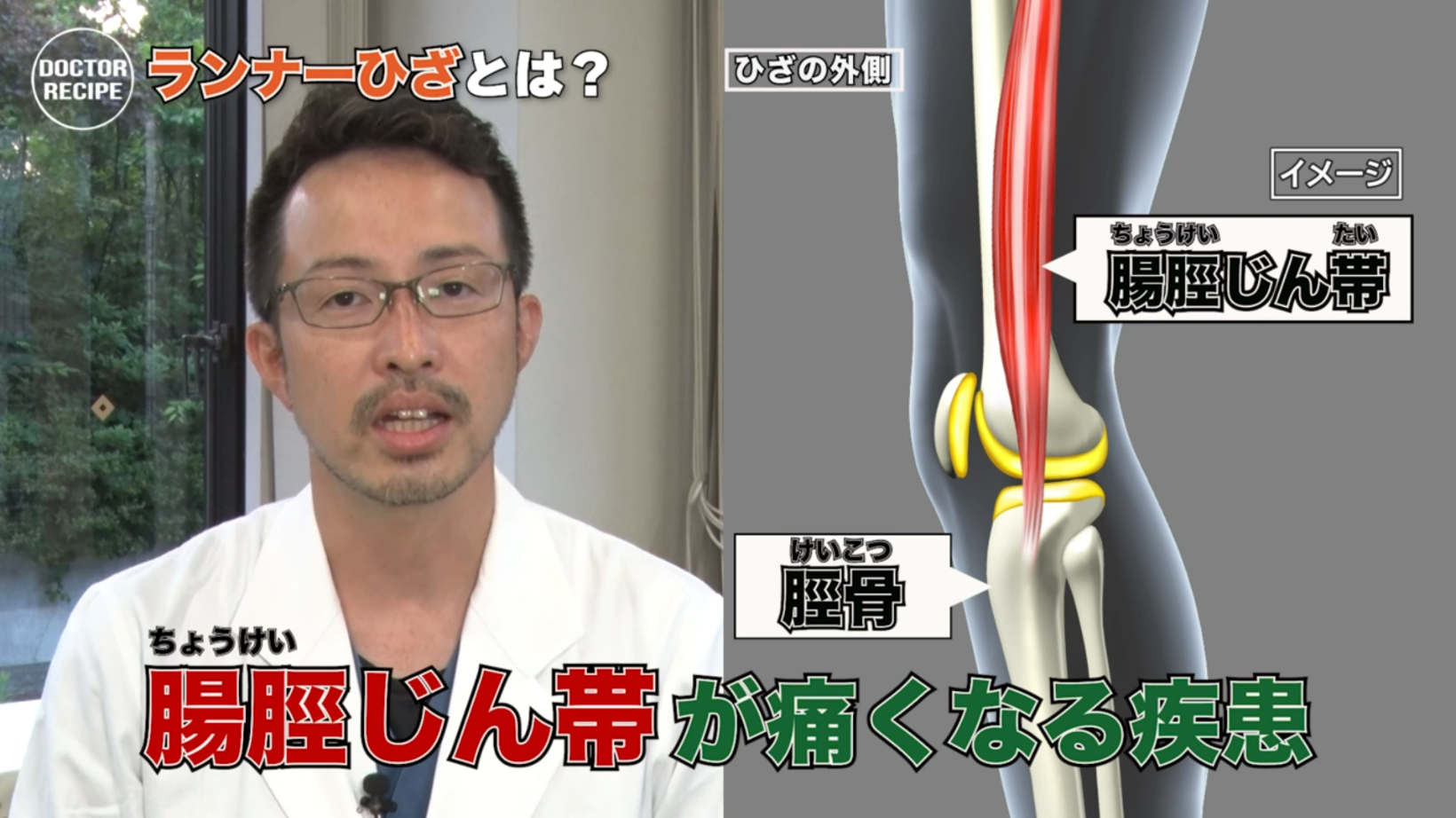 ひざ治療専門医、『玉川病院』柳澤克昭先生が教えてくれたのは、自宅で簡単にできるランナーひざの対処法。柳澤先生によると、ランナーひざとは、別名「腸脛じん帯炎」と呼ばれており、主に長時間のランニングなどを行った際、おしりの筋肉から脛骨の上の方に繋がっているひざのじん帯「腸脛じん帯」が痛くなる疾患なのだそう。