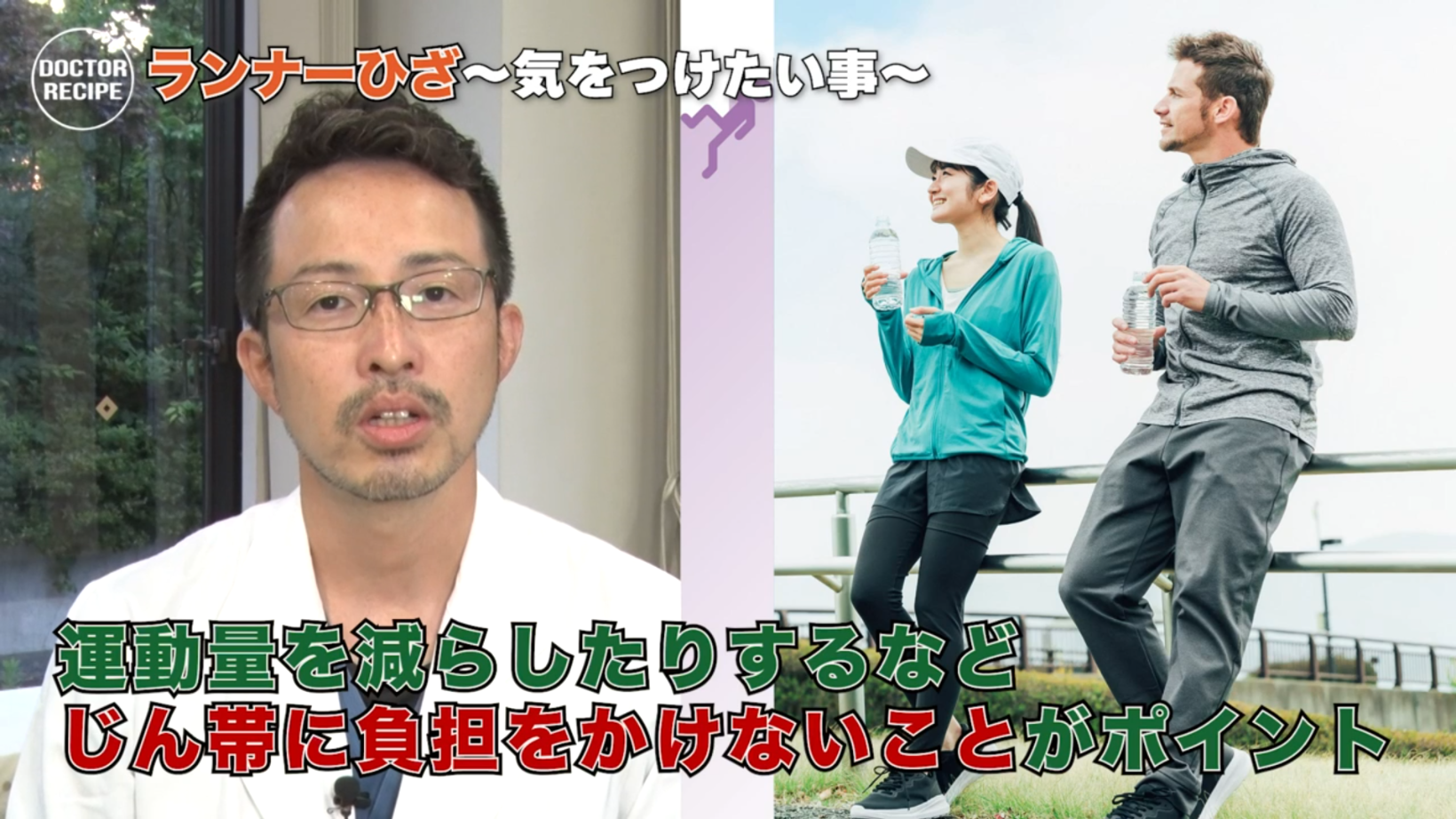 柳澤先生曰く、「放っておくと慢性化して、治りにくくなることもある」というランナーひざ。発症したら安静を心がけ、その後は運動量を減らしたりするなど、じん帯に負担をかけないことがポイントだといいます。