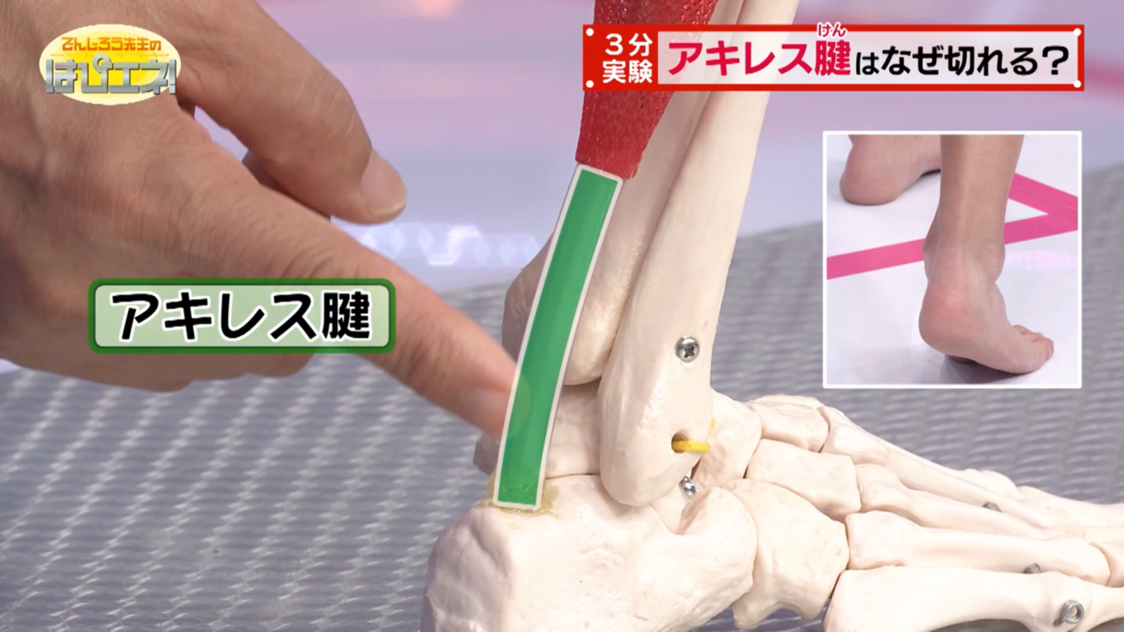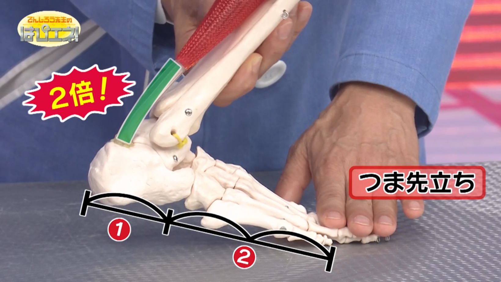 でんじろう先生によると、人間の足の構造を見てみると、「指から足首までの長さ」と「足首からかかとまでの長さ」の比は2対1。そのため、つま先立ちをすると、てこの原理でアキレス腱は、体重の約2倍の力で引っ張られることになるといいます。