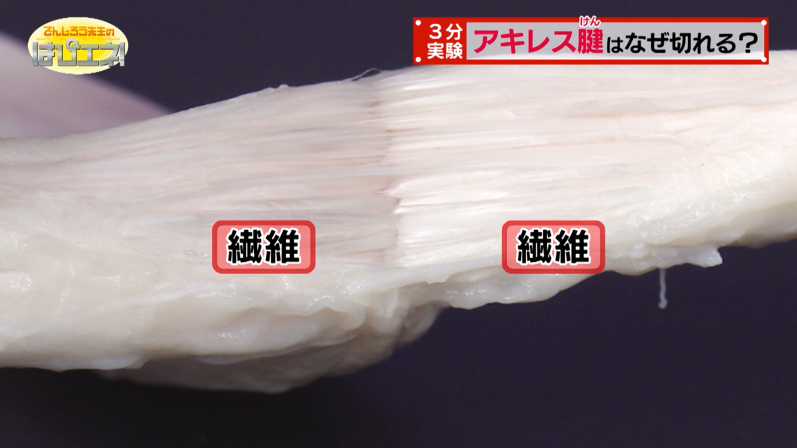 でんじろう先生が、乾燥した牛のアキレス腱にぶら下がってみても、まったく切れる気配がありません。しかし、このように丈夫なアキレス腱でも切れてしまうことがあります。それは、なぜなのでしょうか?