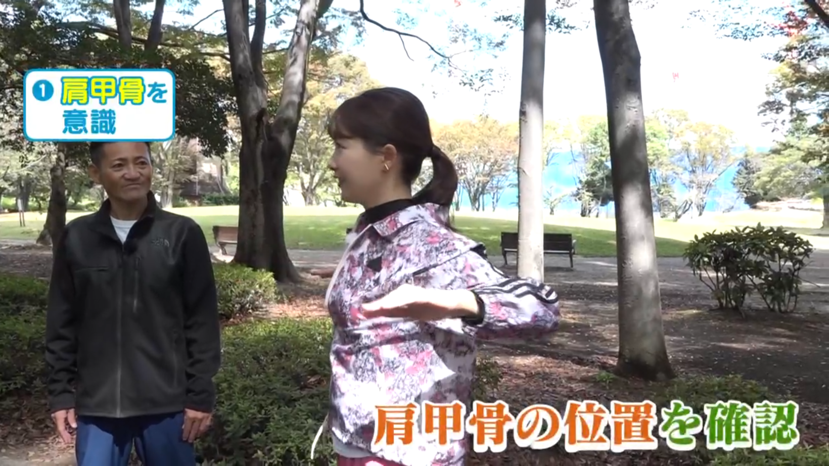 「ウォーキングは正しい歩き方をすれば、1日2,500歩ぐらいで健康の増進になる」と話す春日教授。効果的なウォーキングのポイントは、『上半身の肩甲骨を意識すること』、『歩くときはスターになりきる』の2つ。