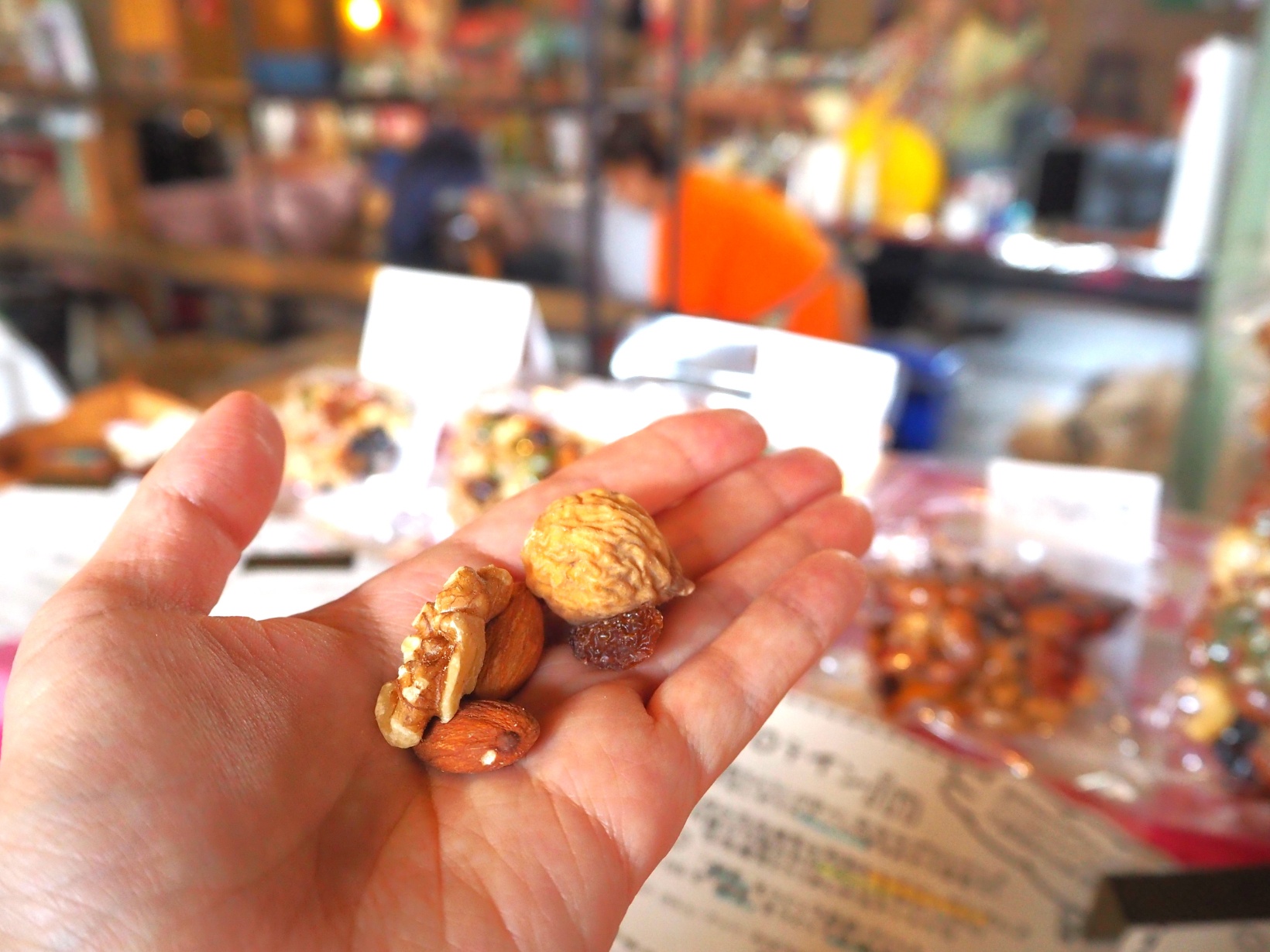 『ナッツ&シードKATE kate』では、ナッツを試食。肌に必要な栄養素を詰めた「OUTDOORブレンド」、たんぱく質をおやつ感覚で摂取できる「プロテインin」など、テーマごとに袋詰めされたナッツを購入することができます。