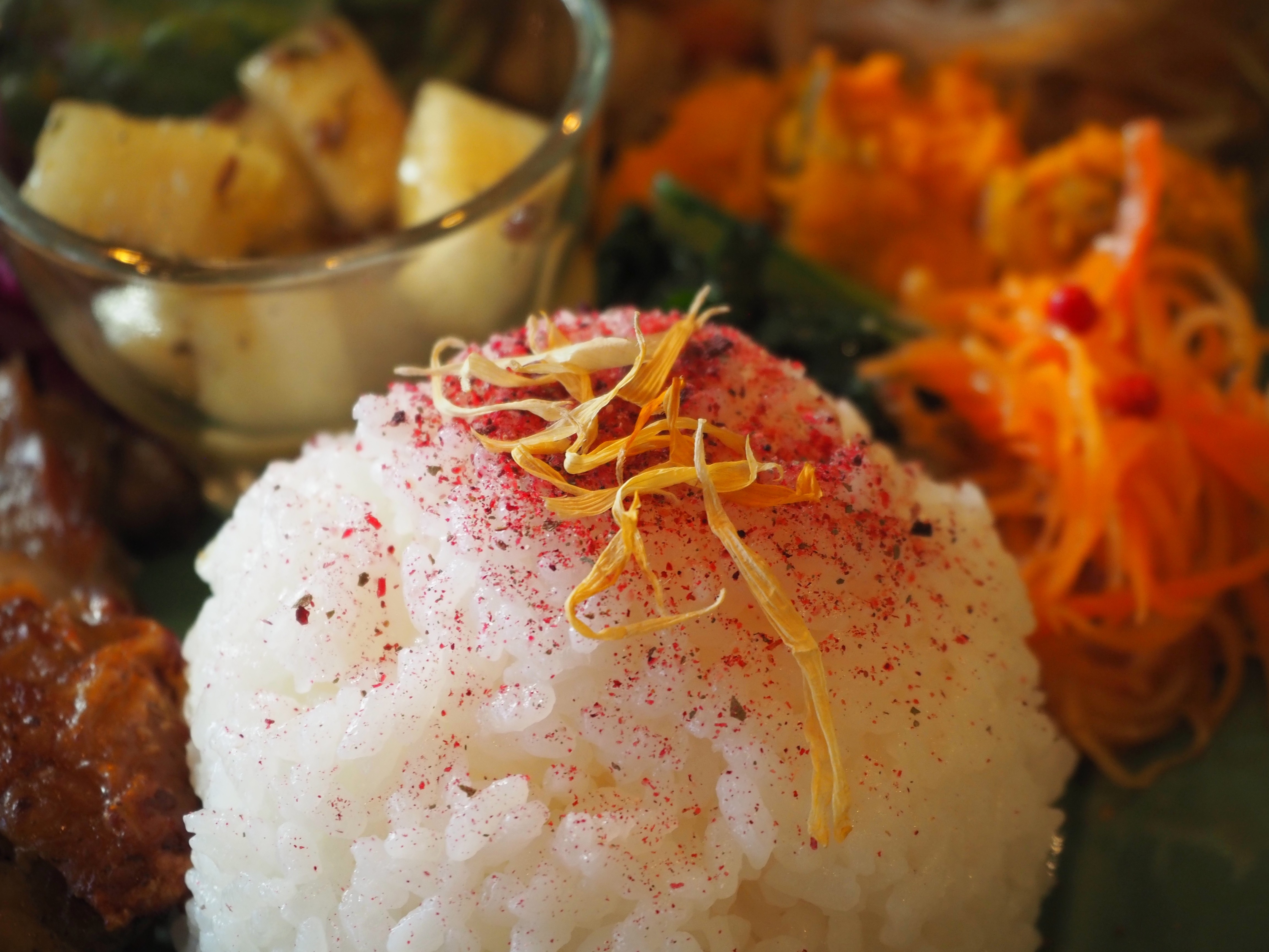 ライスにかかった赤みを帯びたパウダーは、自家製のローゼルソルト。ビタミン豊富で、“ゆかり”のような酸味があります。