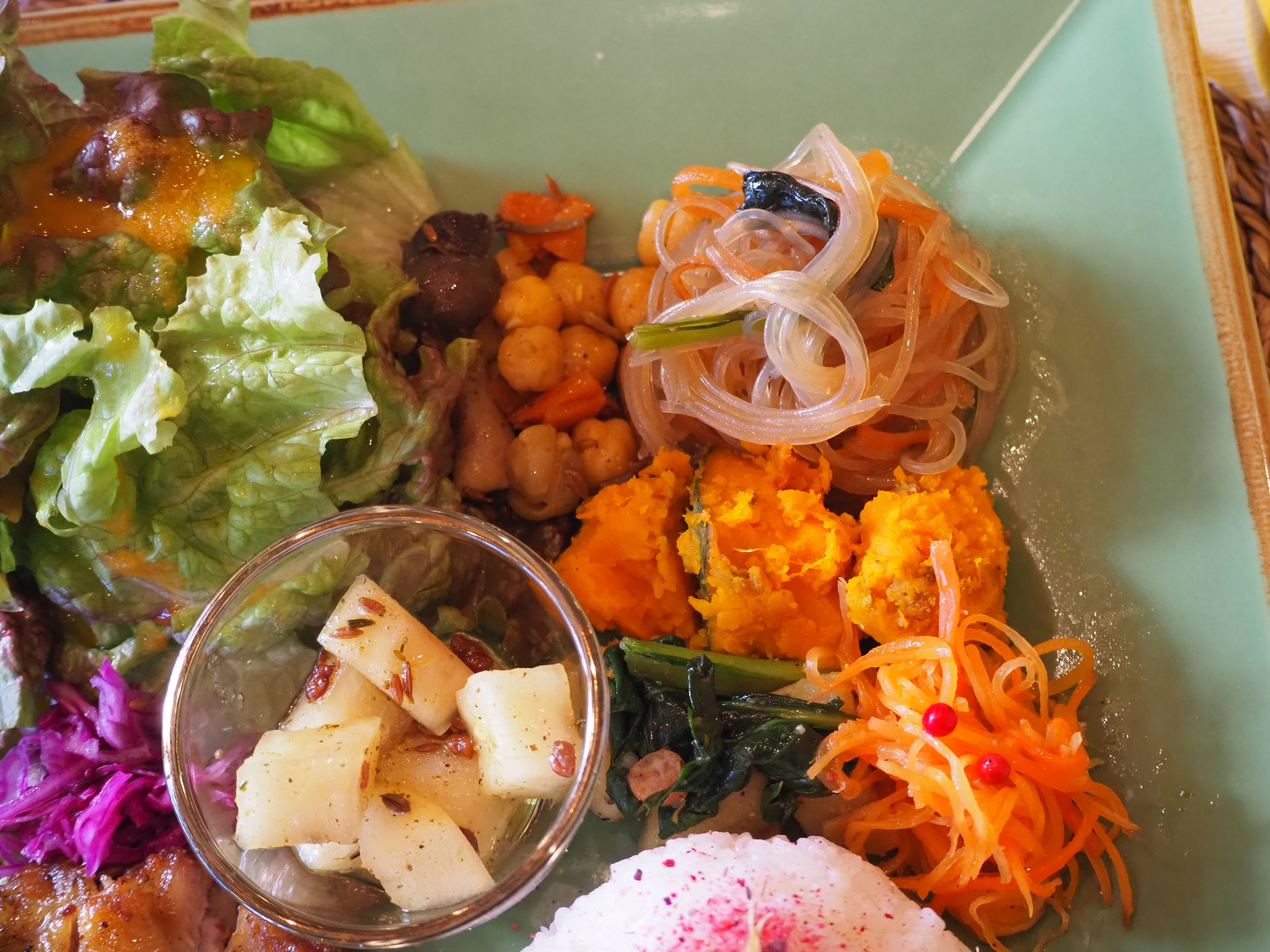 何日も前から恵那鶏をハーブソルトに漬け込み、香りと旨みをじっくり染みこませてから、焼き上げます。見映えとボリュームを担うのは、彩り豊かなデリの数々。チャプチェ、キャロットラペ、大根のアチャール、ひよこ豆のスパイス炒め、 じゃがいものサブジ、かぼちゃのスパイス炒めを味わえます。
