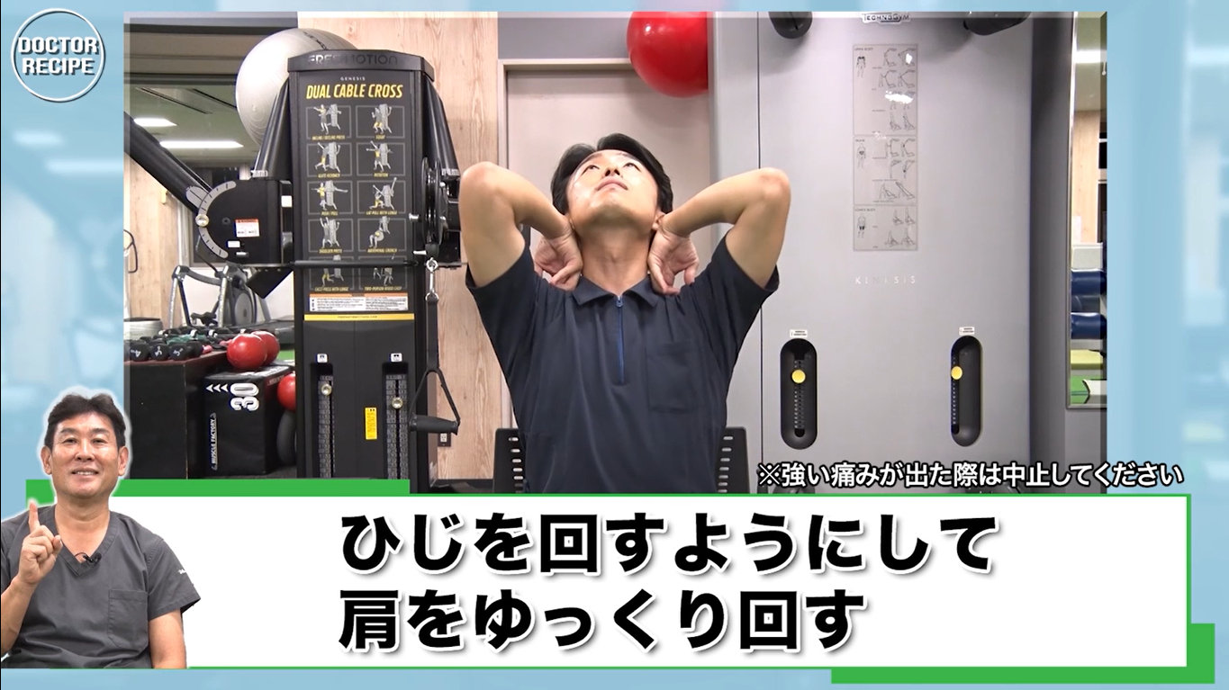 ストレッチは簡単!まずは、首を後ろに反らします。ひじを曲げて指を肩につけたら、ひじをまわすように意識して、肩でゆっくりと円をかきます。肩甲骨を寄せるイメージで行うのがポイント。痛みがある場合は無理をせず、できる範囲で行いましょう。前とうしろ、それぞれ10回ずつが目安です。