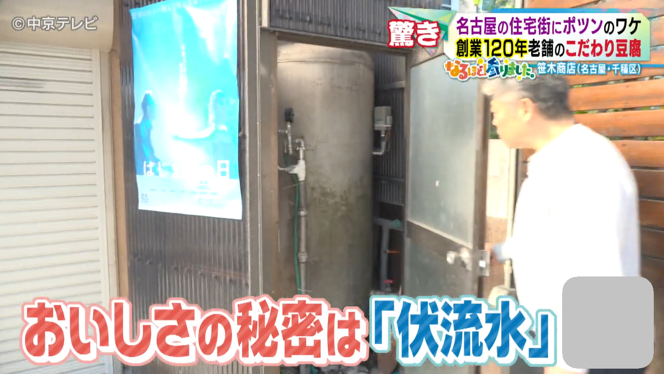 覚王山駅のまわりには、姫ヶ池や二ツ池公園、そして“水が吹き上がる”という意味でつけられたという吹上駅があります。以前ビールの工場があったのも、上質な水があったからこそ。 『笹木商店』の工場は住宅街の中にありますが、周辺の地下深くから汲み上げる”超軟水の伏流水”を使うことで、こだわりの豆腐を生み出しています。