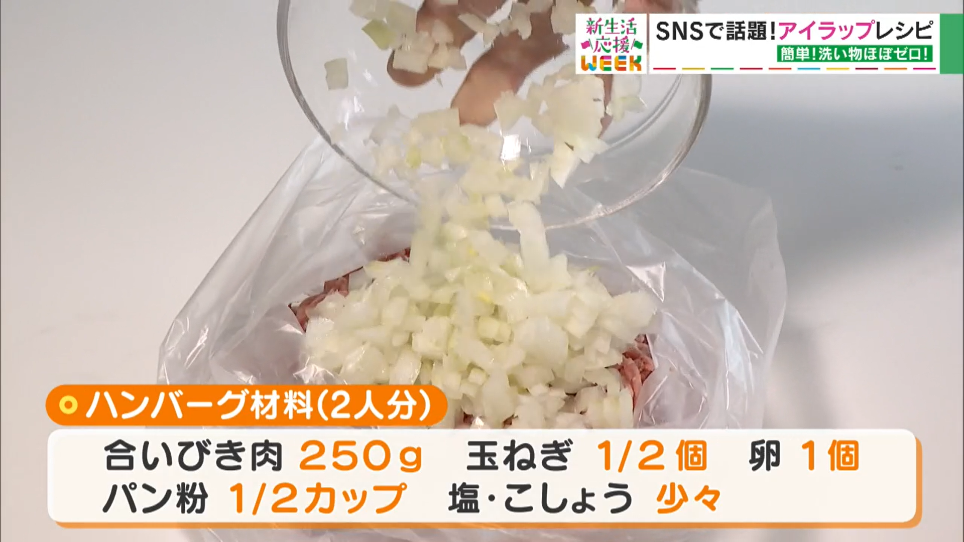 アイラップの中に、ひき肉や玉ねぎ、卵など材料を入れたら、そのままもみ込み、ハンバーグの“たね”を作っていきます。