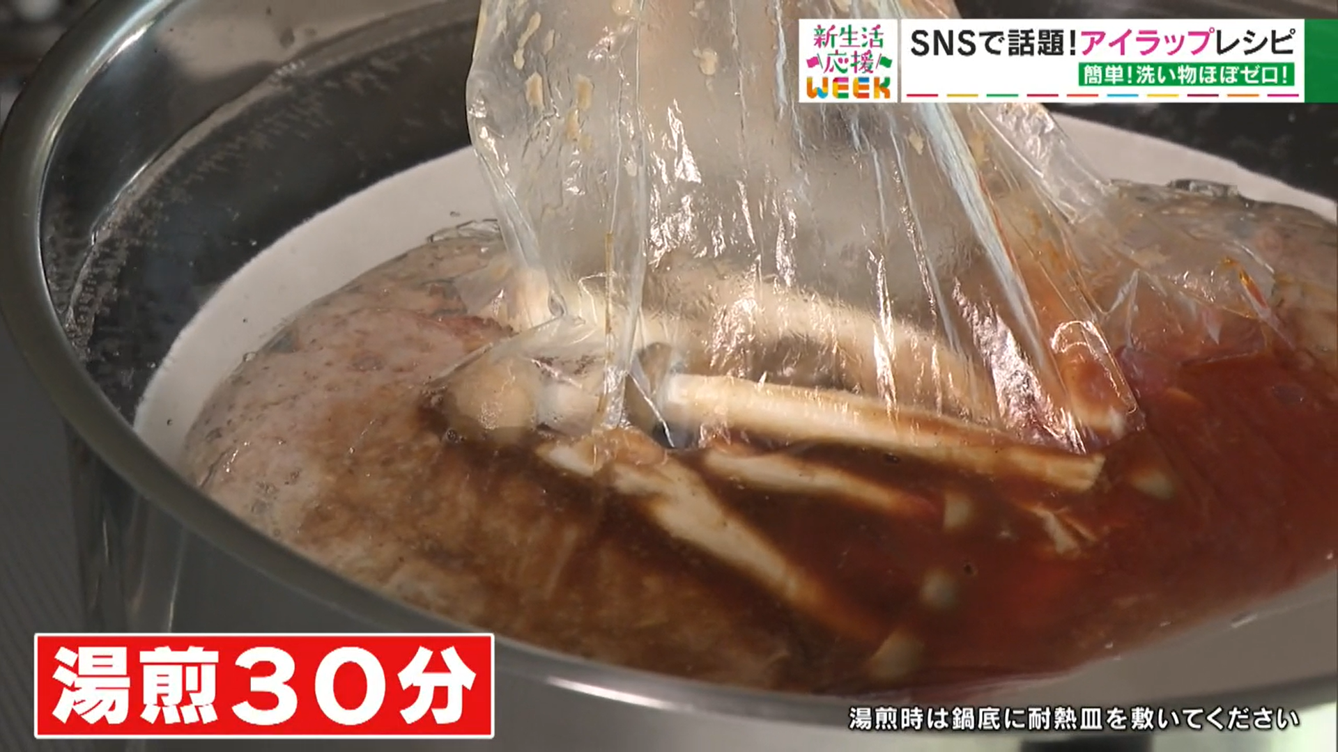 空気を抜いて、ライラップを縛ったら、沸騰したお湯で30分ほど湯煎。湯煎時は、鍋底に耐熱皿を敷いておきましょう。「焦げているかな?」など小さな心配をしなくて済むことも嬉しいポイントです。