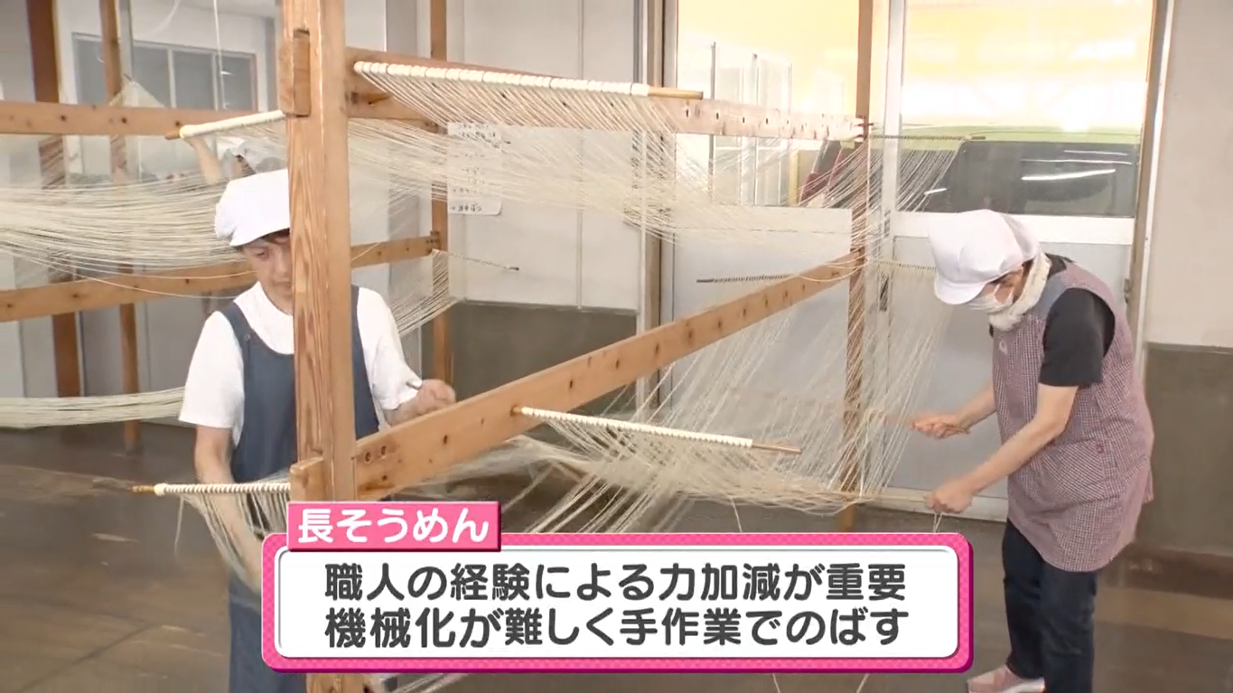 はた織りにも似た動作で作られる“長そうめん”は、職人の経験、そして切れそうで切れない力加減が重要。だからこそ機械化は難しく、これまでずっと手作業で作られてきました。